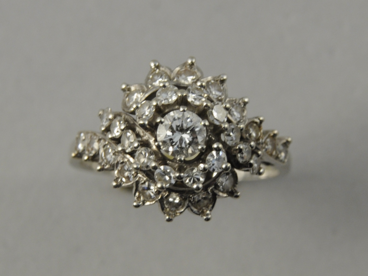 BAGUE en or blanc sertie en gradins ondulés de 23 brillants autour d'un diamant d'environ 0,4 ct de taille moderne. Fabrication française des années 1970. Poids brut: 5,1 g.