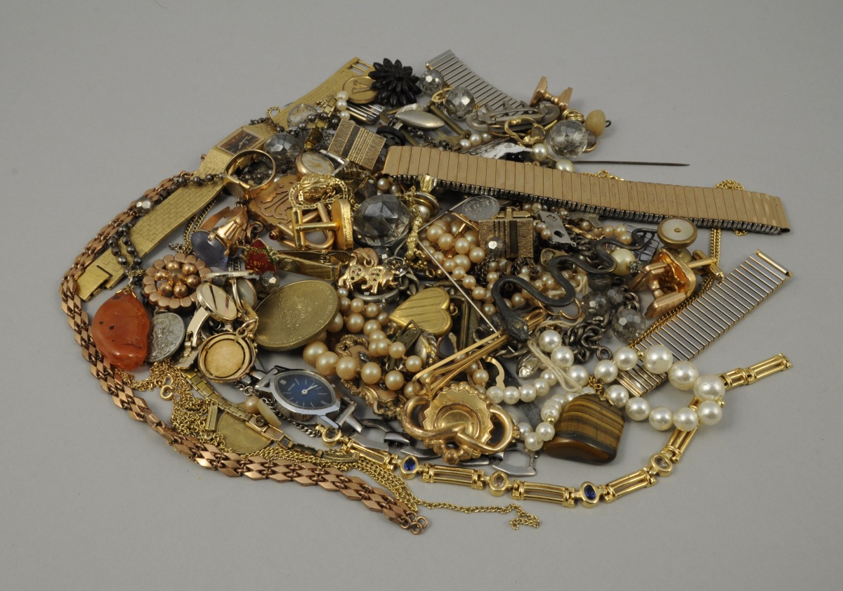 LOT DE BIJOUX FANTAISIE comprenant notamment boutons de manchette, montres-bracelets, colliers, pendentifs, broche, bague. XXème.