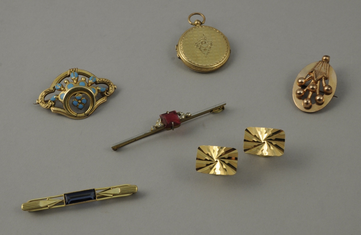-Une broche de forme oblongue en métal doré à décor de stries et pointes de flèche et sertie d'une pierre de synthèse bleue de forme rectangulaire. Long. 5,7 cm.