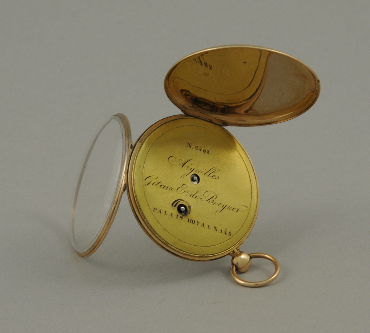 Ce modèle de montre à gousset, très plate est à rapprocher des créations du célèbre horloger suisse Abraham Louis BRÉGUET (Neuchâtel, 1747 - Paris, 1823). En effet, le boîtier plat à décor guilloché se retrouve sur plusieurs des créations du maître ainsi que le poinçon d'or à la tête de buf, preuve de la contemporanéité des créations. Bréguet a donné ses lettres de noblesse à l'horlogerie et a considérablement fait évoluer sa technique par de nombreuses inventions. Ayant comme clients jusqu'à Louis XVI et Marie-Antoinette, et avec seulement quatre mille créations, Bréguet influencera longtemps le XIXème siècle aussi bien techniquement que stylistiquement. Dès lors, on comprend que Giteau, son élève, se soit largement inspiré du fameux cadran amati et décentré de son maître mais en ait également conservé les fines aiguilles. Giteau a également produit des pendules à sujet et en forme d'urne sous la Restauration.