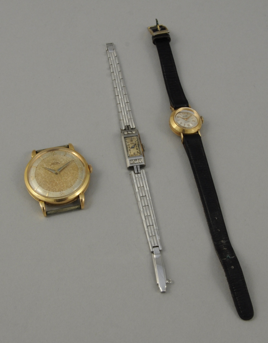 -Une montre de montre-bracelet d'homme de forme ronde en or. Cadran décoré de pointes de diamant à index bâtonnets et chiffres arabes. OMEGA. Poids brut. 34 g.