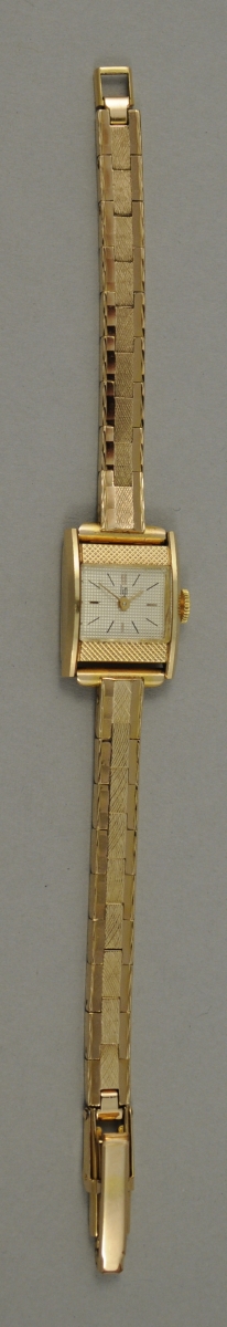 MONTRE-BRACELET de dame à mouvement mécanique. Le boîtier de forme carrée en or, le tour de poignet articulé en métal doré. Cadran à index bâtonnets et attaches à décor de pointes de diamant. LIP. Long. 16 cm. Poids brut: 22,2 g.