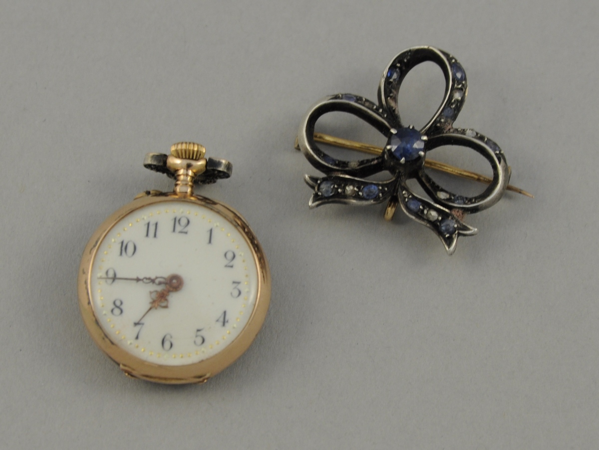 MONTRE de COL à remontoir au pendant en or rose. Le cadran émaillé blanc indiquant les heures en chiffres arabes. Le dos du boîtier pavé de façon circulaire de strass blancs et bleus. Diam. 2,4 cm. Elle est assortie de sa broche adoptant la forme d'un ruban noué en argent serti de même. Épingle en or. Poids brut. 18,7 g.