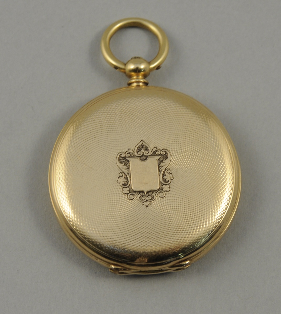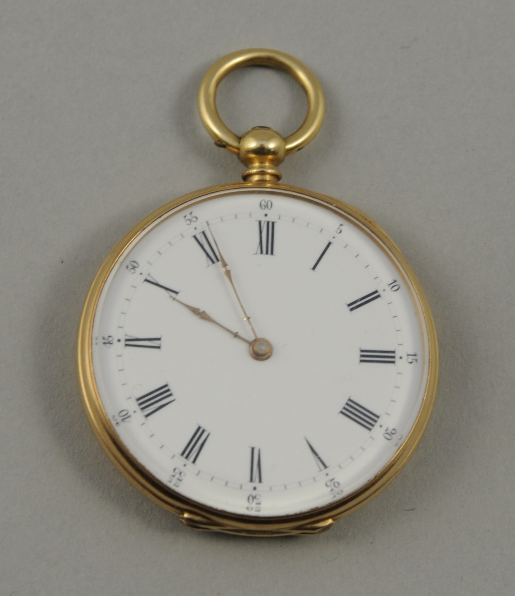 MONTRE de GOUSSET à clef, en or. Cadran émaillé blanc indiquant les heures en chiffres romains et les minutes en chiffres arabes. Martin Marchinville à Genève. Echappement à cylindre, huit trous rubis. Numérotée 42981. Clapet à décor d'un écu flanqué de volutes feuillagée sur fond guilloché. Poids brut. 47,1 g. Diam. 4 cm. Poids brut: 47,1 g.