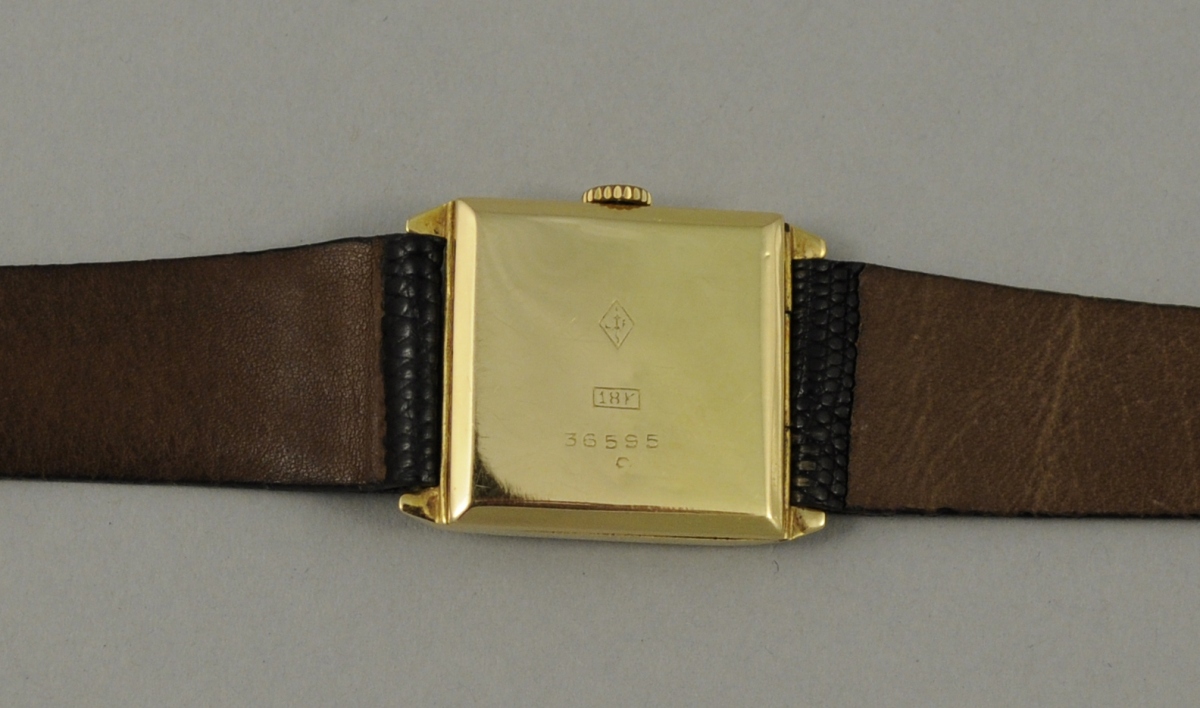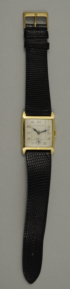 MONTRE BRACELET d'HOMME, boîter en or. Double cadran émaillé blanc, heures et secondes, chiffres arabes. Bracelet cuir. Poids brut 21,9 g.