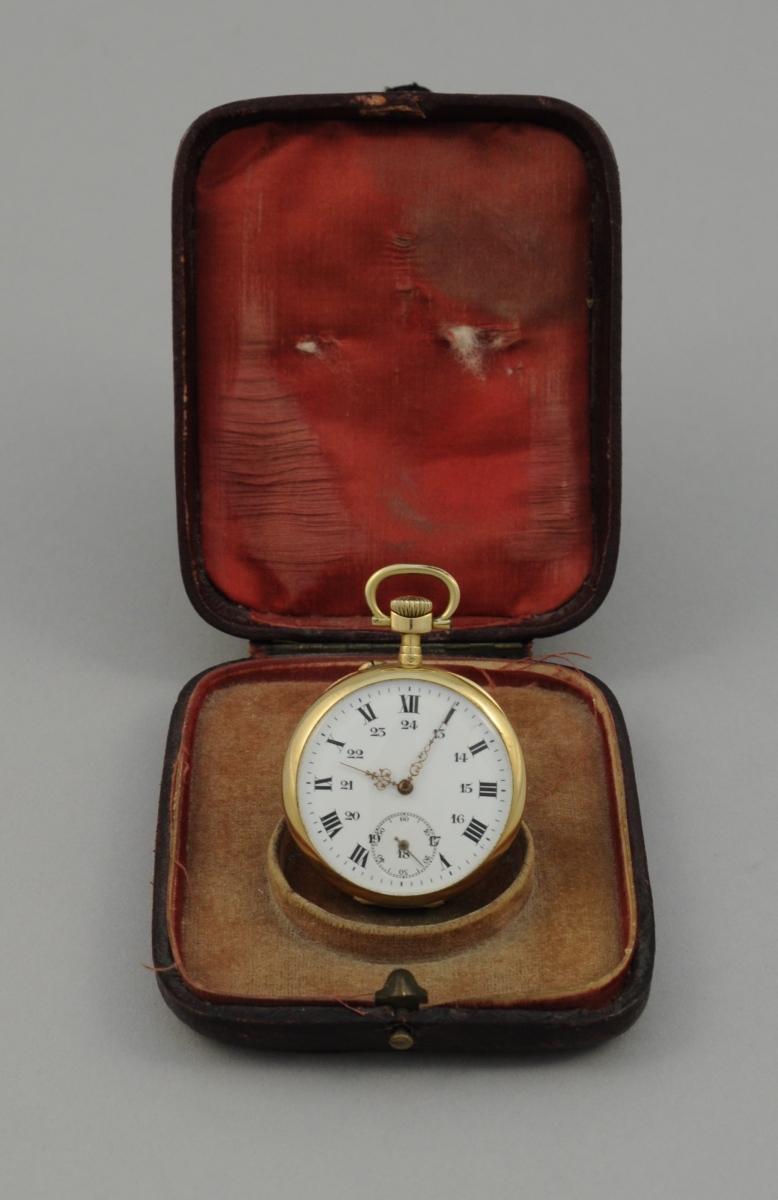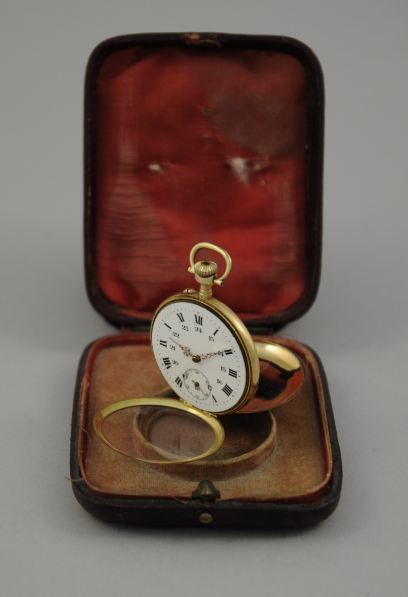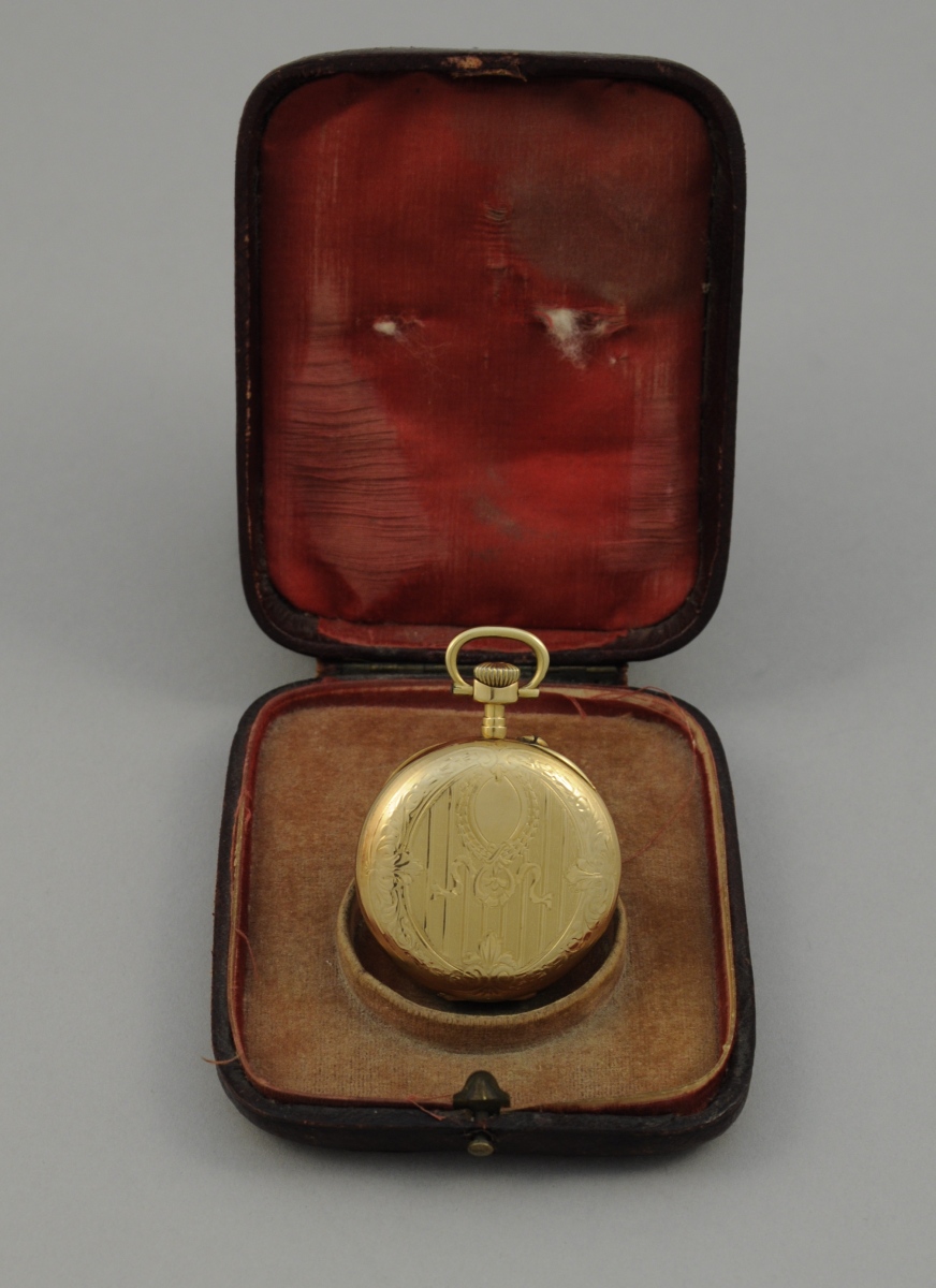 MONTRE de GOUSSET à remontoir au pendant en or. Double cadran émaillé blanc, heures et secondes. Motif d'un médaillon avec couronne de laurier et ruban noué, frise de feuillages stylisés et feuilles d'acanthe au dos du boitier. Poids brut: 62,4 g.