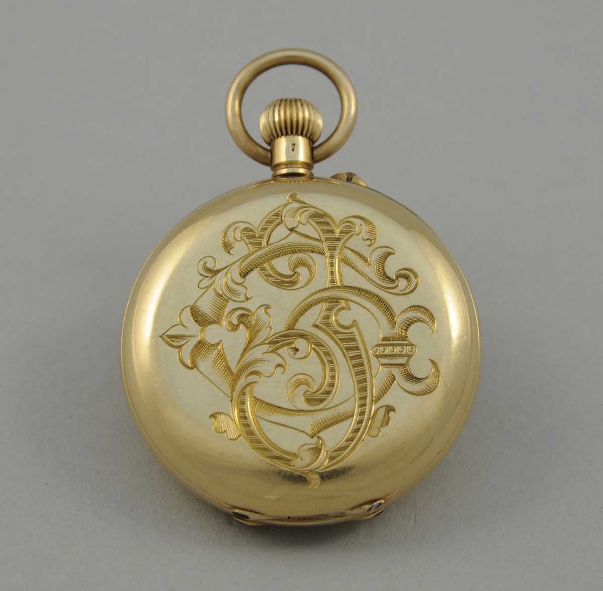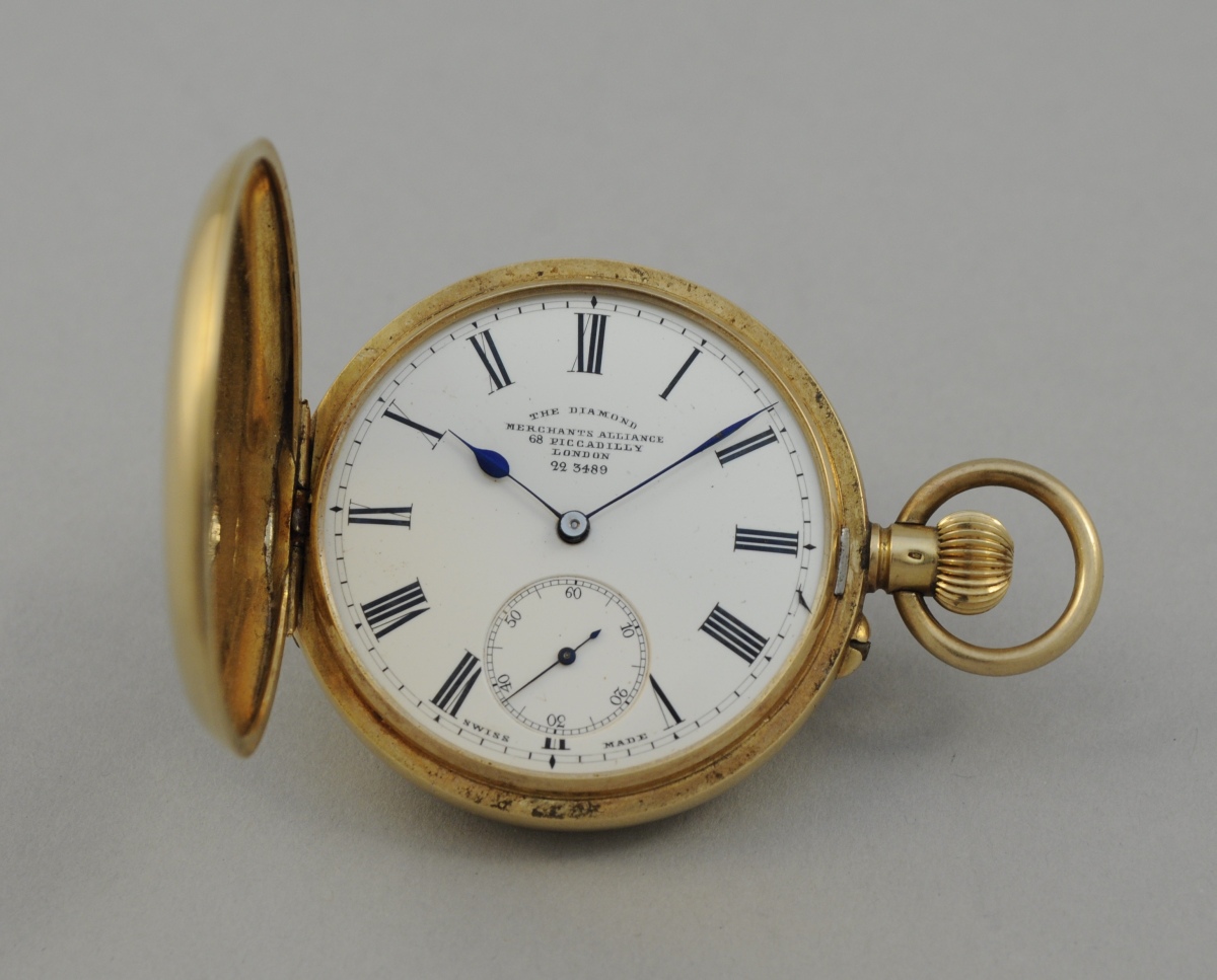 MONTRE DE POCHE de forme savonnette à remontoir au pendant en or jaune monogrammé, cadran émaillé blanc à chiffres romains trotteuse à six heures, balancier bimetallique à compensation, échappement à ancre. Cadran signé: "The diamond merchants alliance (...) London".