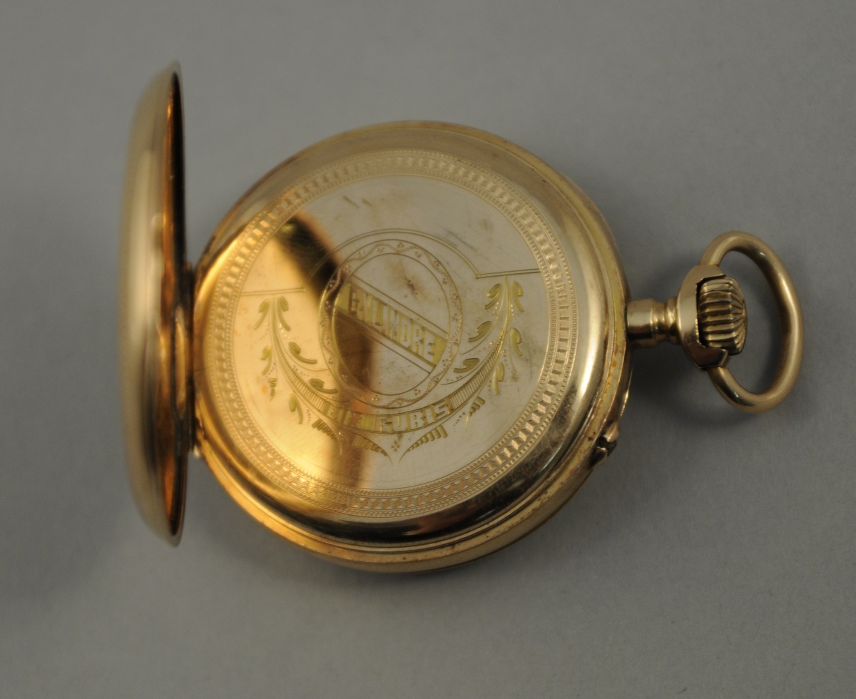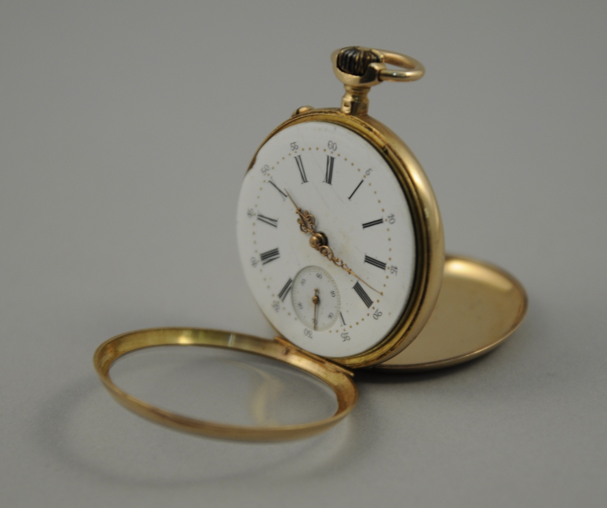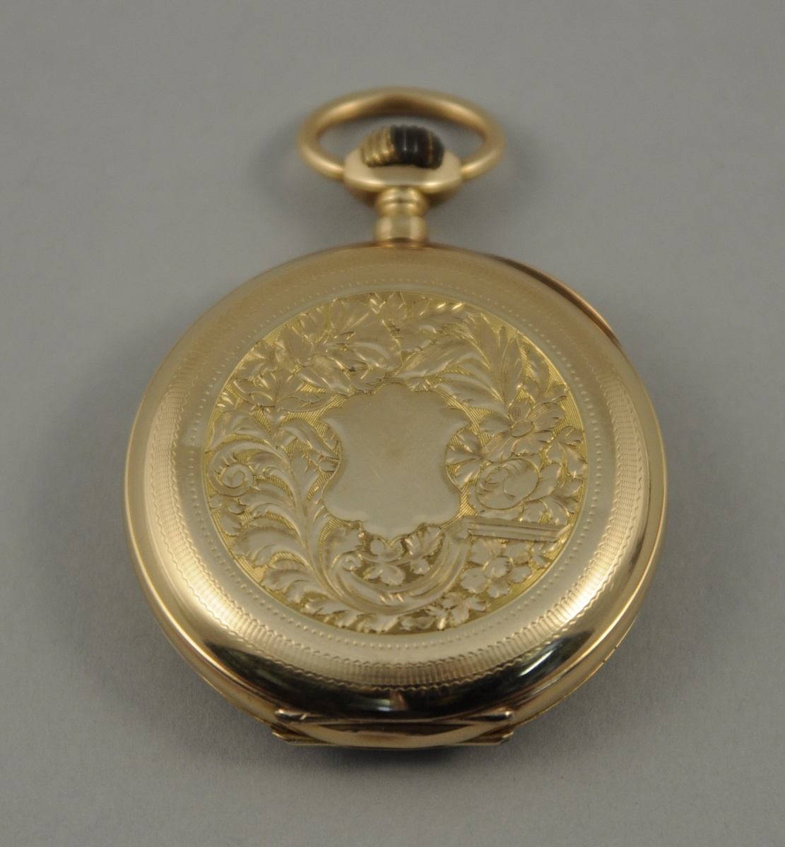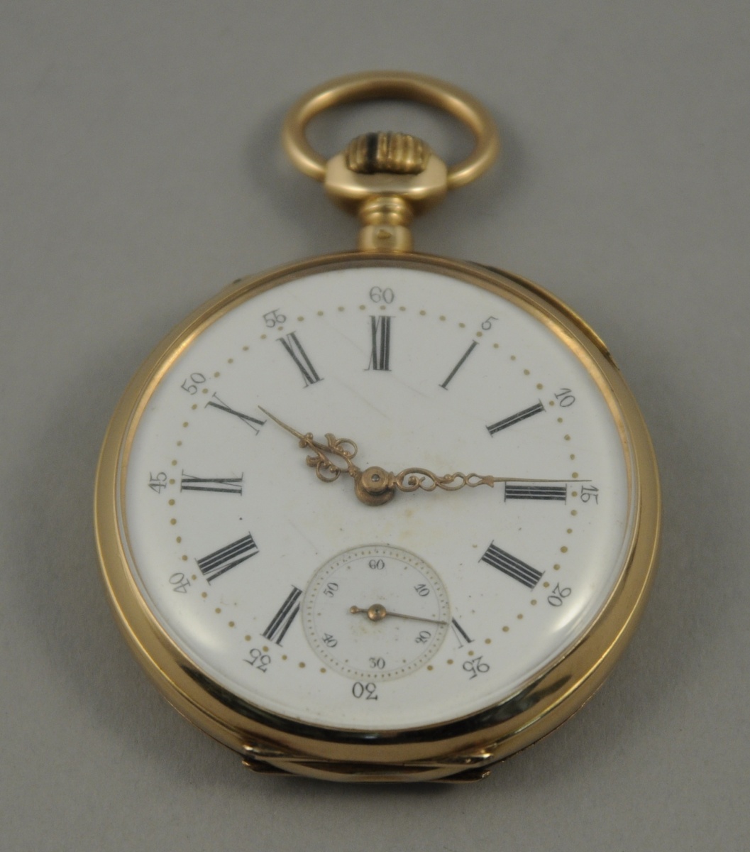 MONTRE de GOUSSET en or. Remontoir au pendant, mécanisme à cylindre dix rubis, double cadran émaillé blanc, heures et secondes. Motif avec écusson uni, entourage de rinceaux feuillagés et guillochage au dos du boitier. Diam. 4,5 cm. Poids brut: 62,8 g.