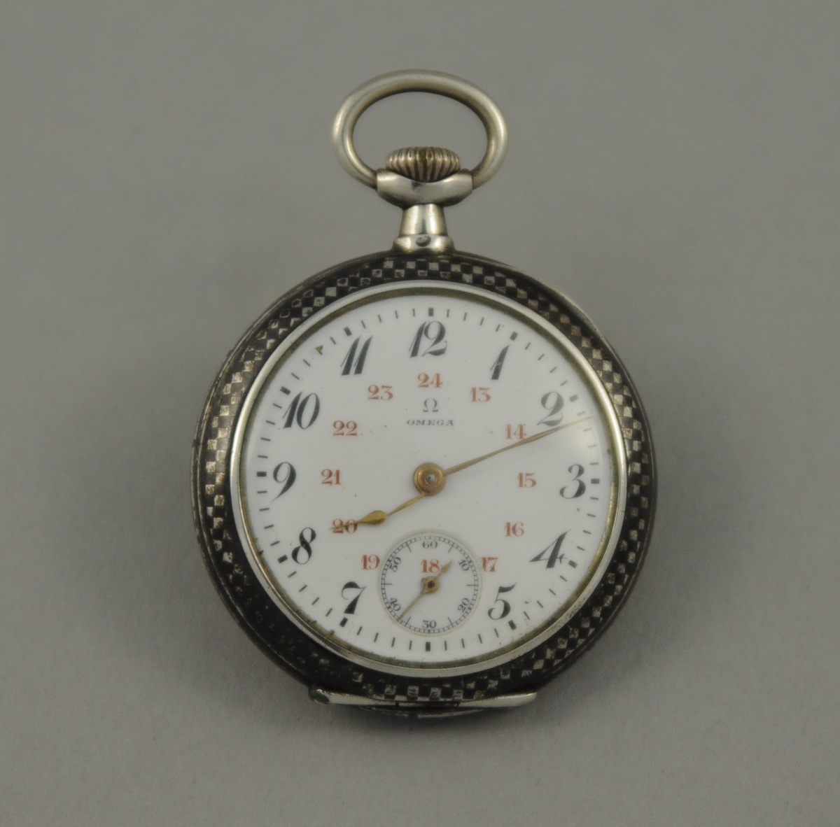MONTRE-REMONTOIR de poche en argent émaillé de carreaux noirs, et écusson doré ; mouvement signé OMÉGA à double cadran dont trotteuse.