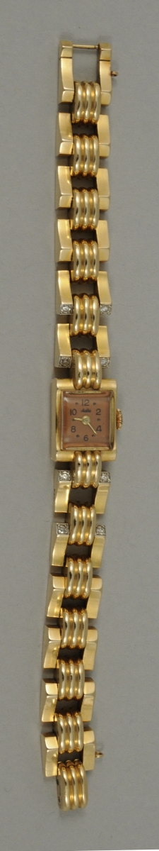 MONTRE-BRACELET de dame en or, mouvement rectangulaire signé d' ACETO n°1163 ; bracelet genre maille tank orné de 8 petits diamants en attache.