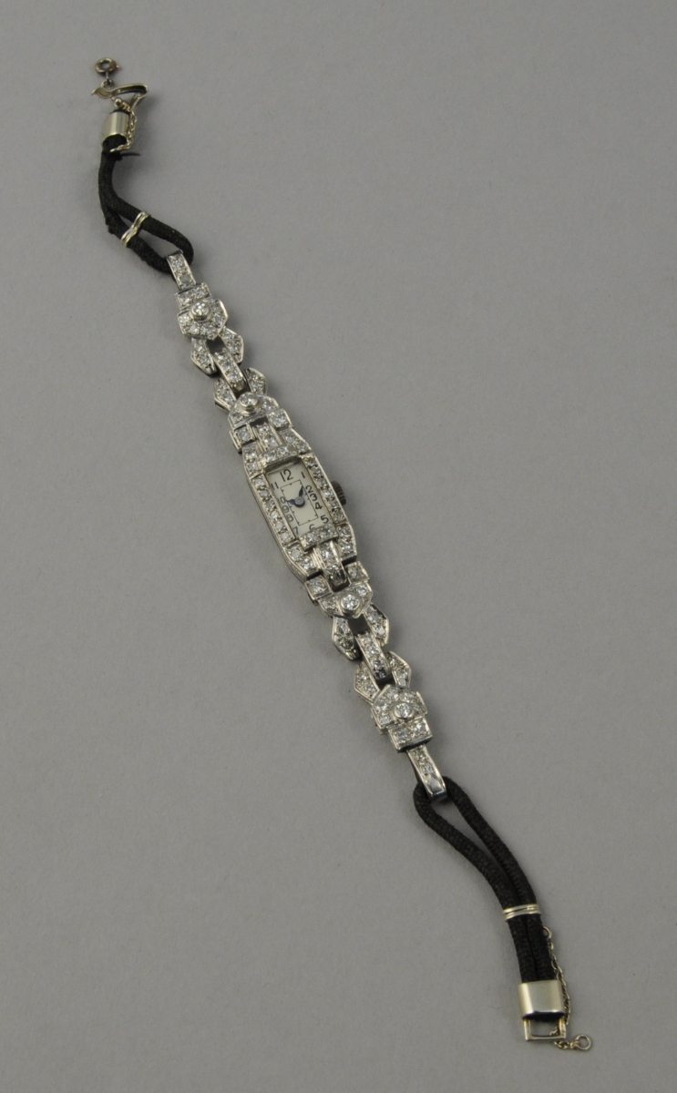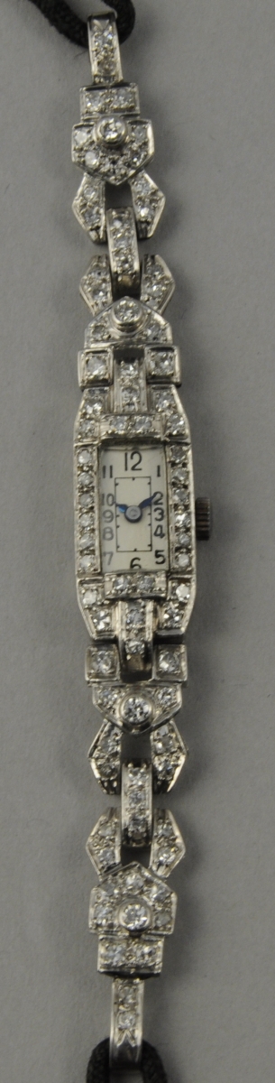 MONTRE BRACELET de dame, la montre rectangulaire et les attaches en platine serties de diamants taillés en 8/8, mouvement mécanique, tour de poignet double cordonnet en tissu. Poids brut: 16 g.