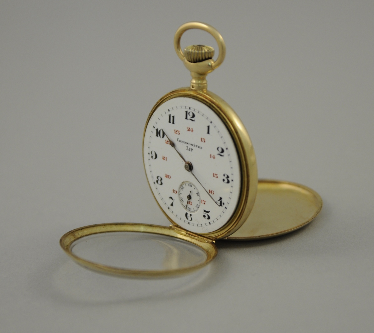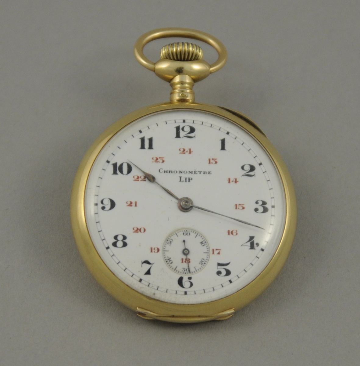 MONTRE de GOUSSET en or. Remontoir au pendant, double cadran émaillé blanc, heures et secondes. Marque "Chronomètre LIP". Poids brut: 64,4 g. Diam. 4,7 cm.