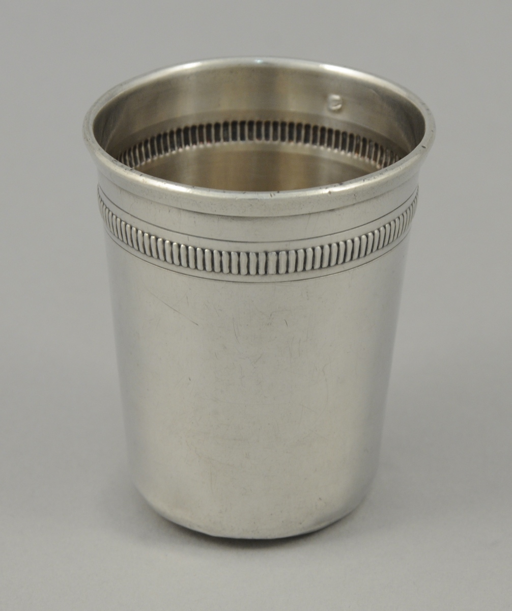 TIMBALE droite à décor repoussé d'une frise de godrons. Poinçon Minerve. Début du XXème. Haut. 7,7, Diam. 6,3 cm. Poids: 60 g.