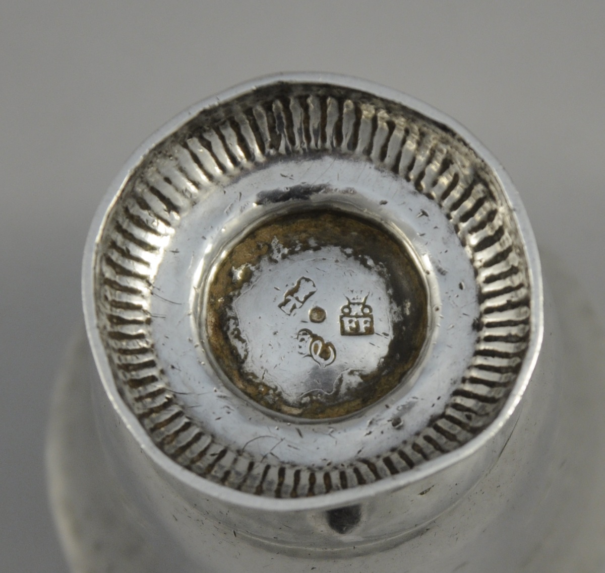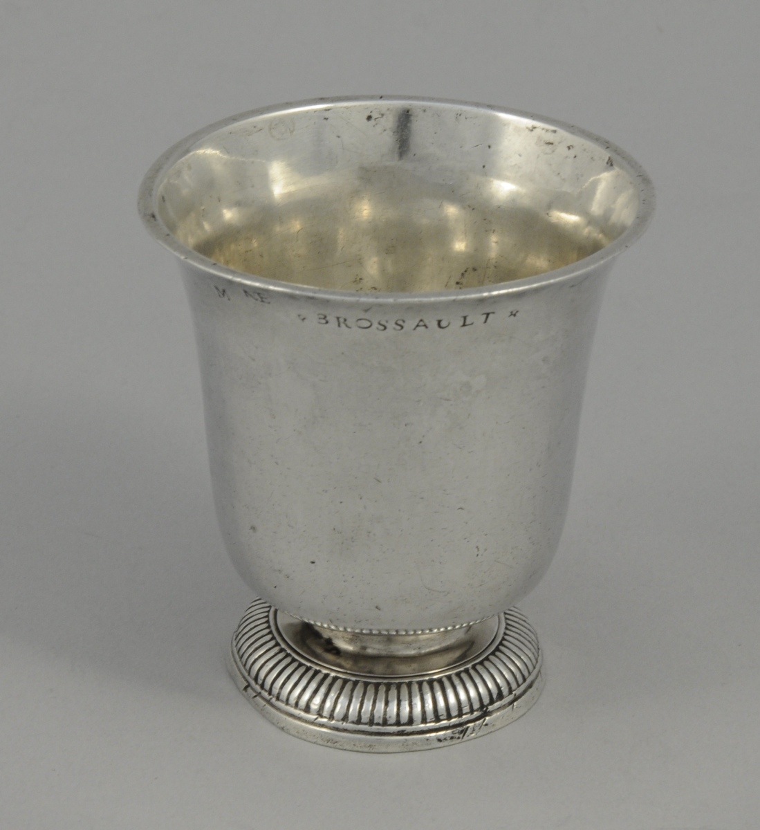 TIMBALE tulipe en argent, sur piédouche orné de godrons. Gravée "M NE * BROSSAULT*". Poinçon de Maître "FF". Tours, XVIIIème. Haut. 8,8, Diam. 8,1 cm. Poids: 130 g.