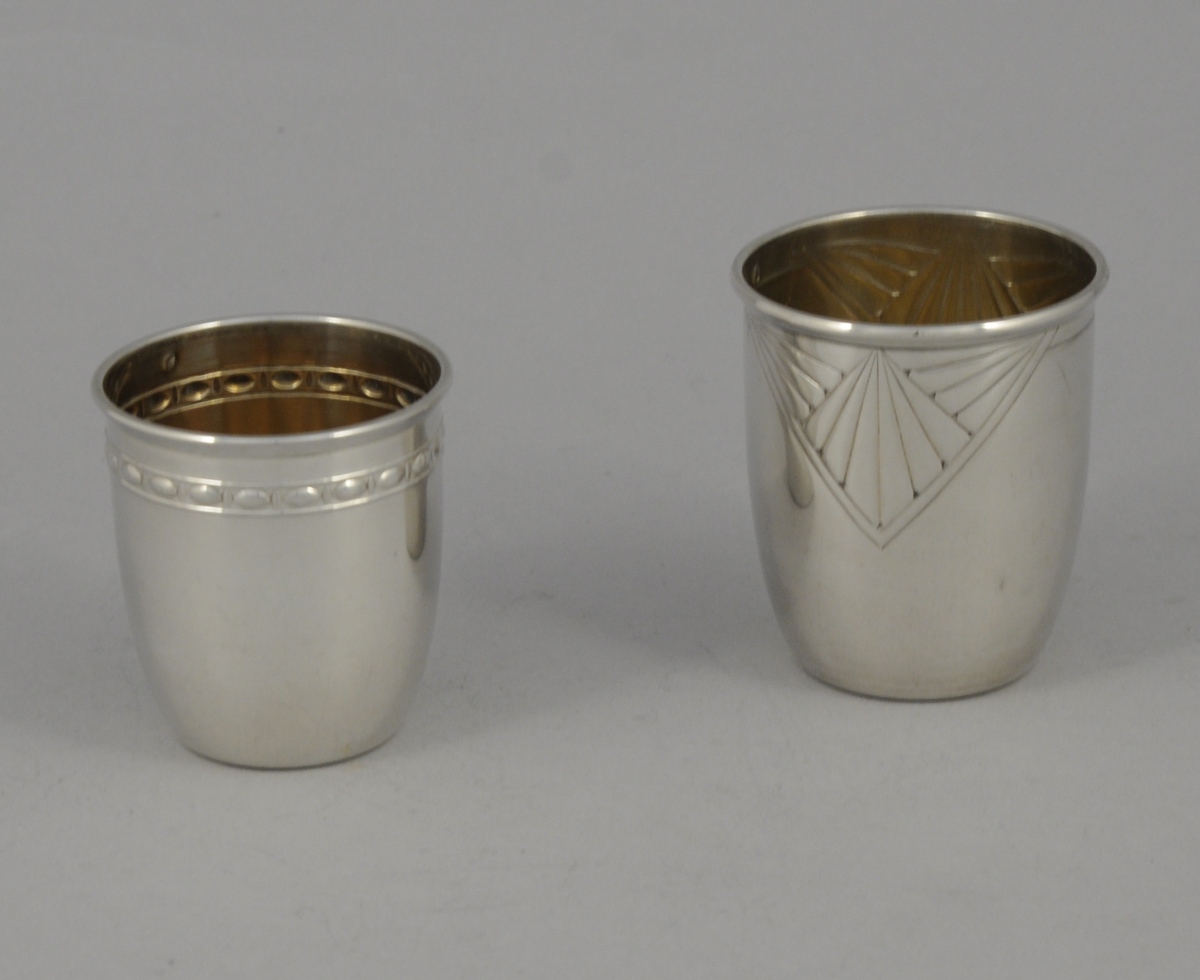 Réunion de deux TIMBALES en argent. L'une à décor de motifs Art Déco ; l'autre ornée de petits godrons sur le rebord.