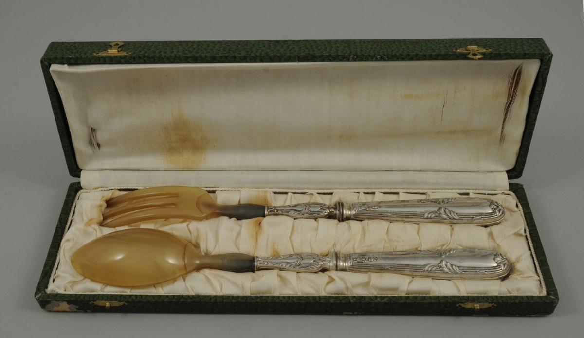COUVERT à salade. Manches en argent fourré à décor de motifs néoclassiques tels que joncs rubannés, noeuds et palmes. Cuilleron et fourchon en corne. Écrin. Long. 28,5 cm. Poids brut: 165 g.