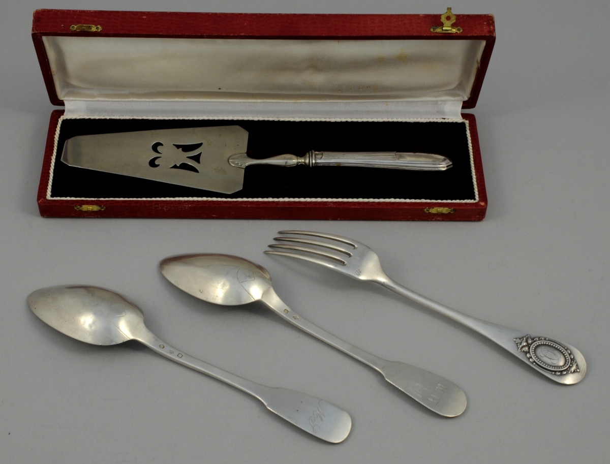 -Une PELLE À GÂTEAU. Le manche cannelé en argent fourré. Poinçon Minerve. La spatule en métal blanc ornée d'un motif géométrique ajouré. Long. 27,2 cm. Poids brut: 85 g.