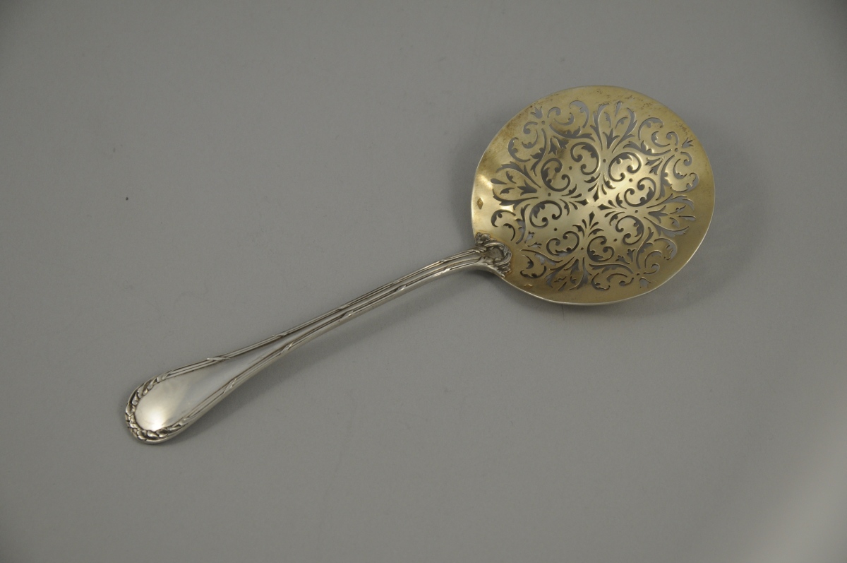 CUILLÈRE à saupoudrer en argent et vermeil. Manche à décor de joncs rubannés et feuillages. Pelle ajourée d'agrafes et feuillages. Style Louis XV. Fin XIXème-début XXème. Poids: 90g.