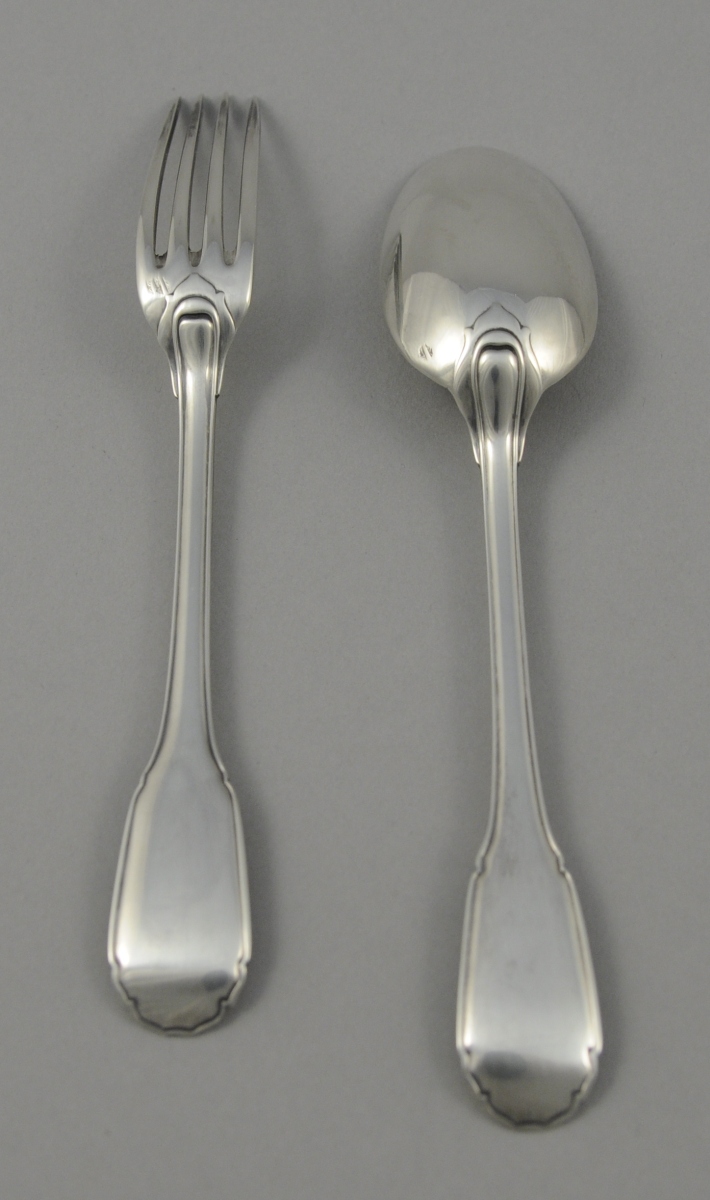 PUIFORCAT. COUVERT de Baptême, modèle au filet, en argent. Poinçon Minerve. Fin du XXème. Long. 17 cm. Poids: 85g.