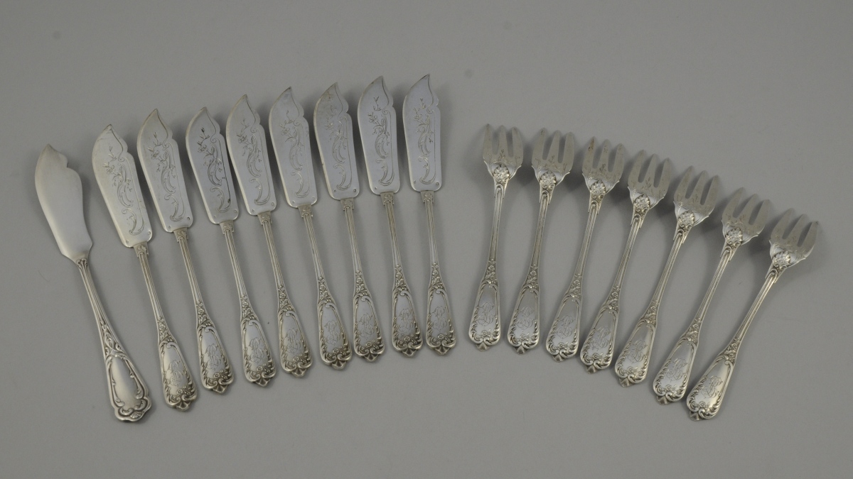 Suite de sept COUVERTS à poisson et un couteau au modèle en argent. Décor de cartouches à croisillons, de coquilles et de fleurs. Monogrammés BL. Poinçon tête de Mercure.