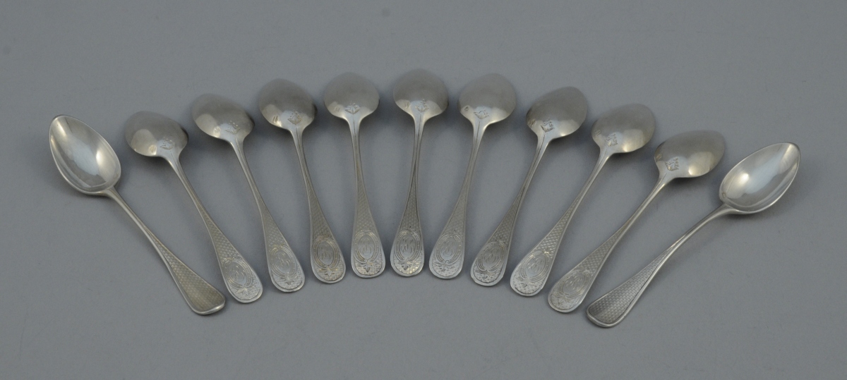 Suite de onze CUILLÈRES à moka en argent. Décor de chevrons, d'une fleur sous le cuilleron et monogrammées "BE". Poinçon Minerve. Poids: 140 g.
