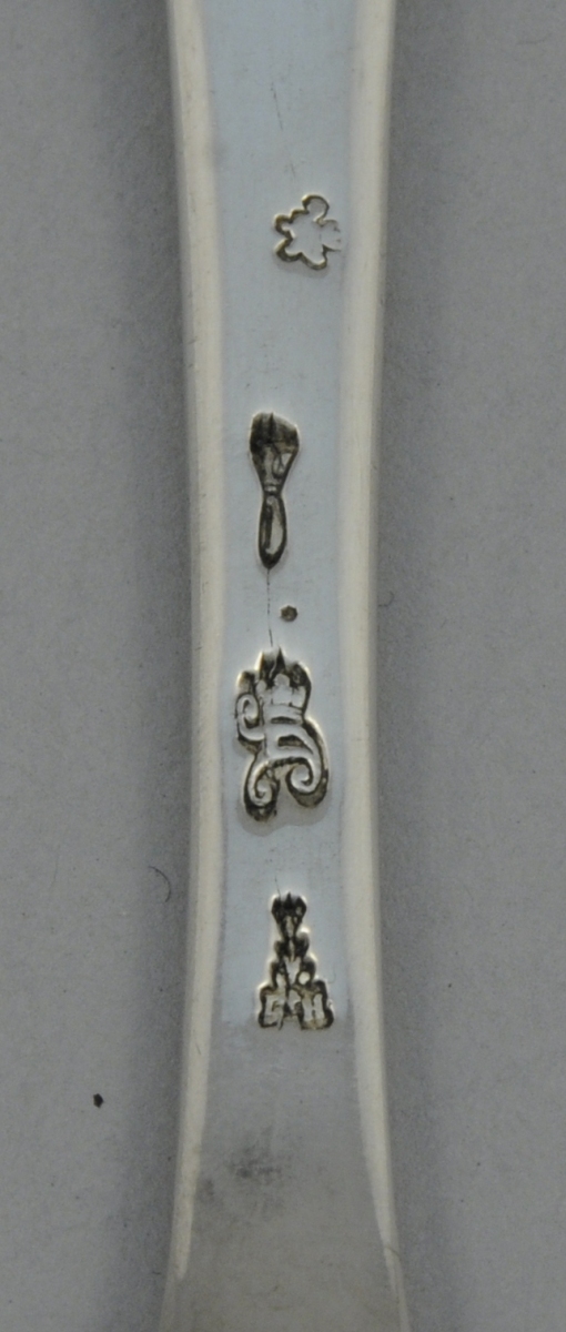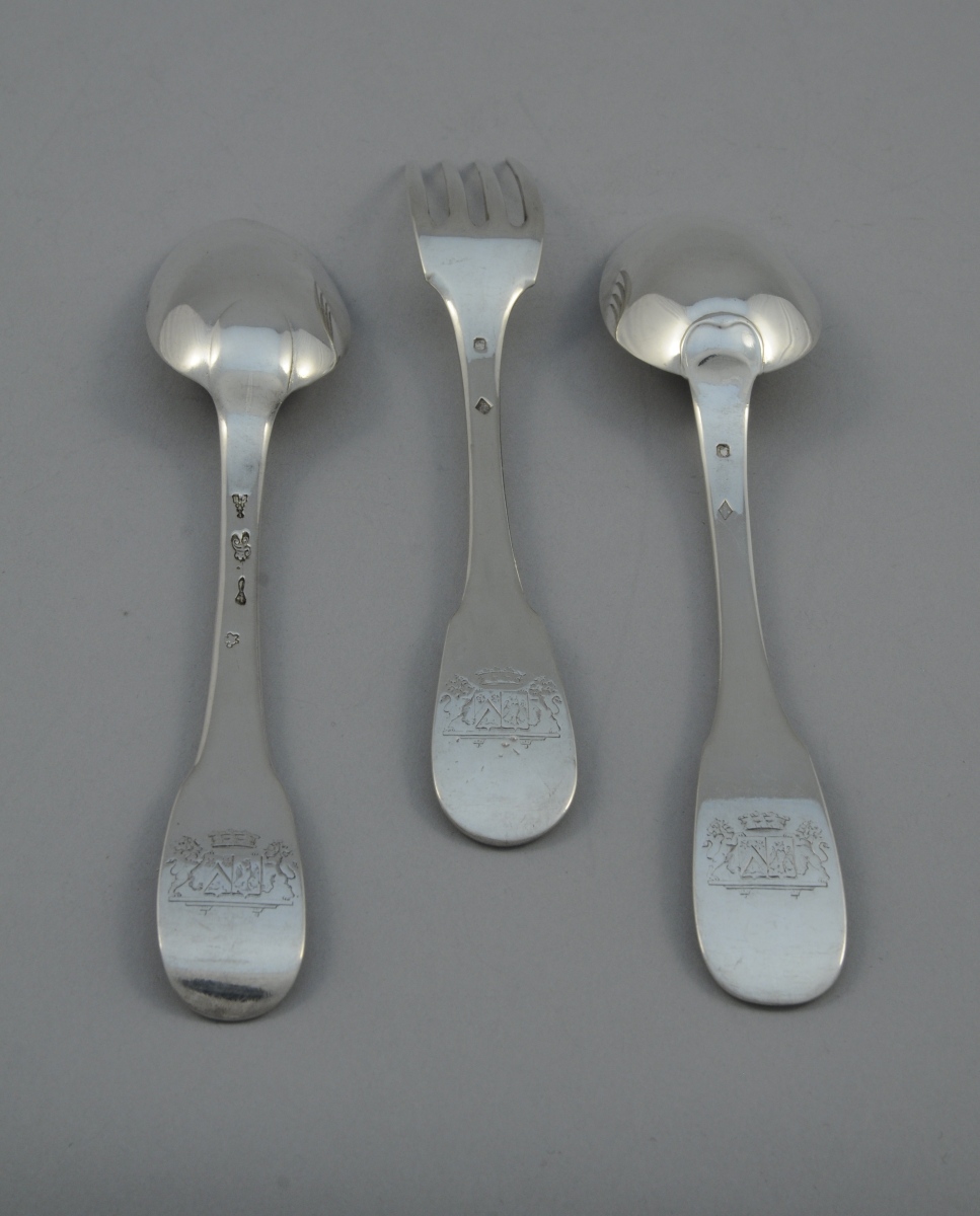 Un COUVERT et une CUILLÈRE en argent, modèle uniplat. La cuillère portant des poinçons XVIIIème ; le couvert au poinçon Minerve. L'ensemble porte des armoiries d'alliances soutenues par des lions et surmontées d'une couronne de baron.