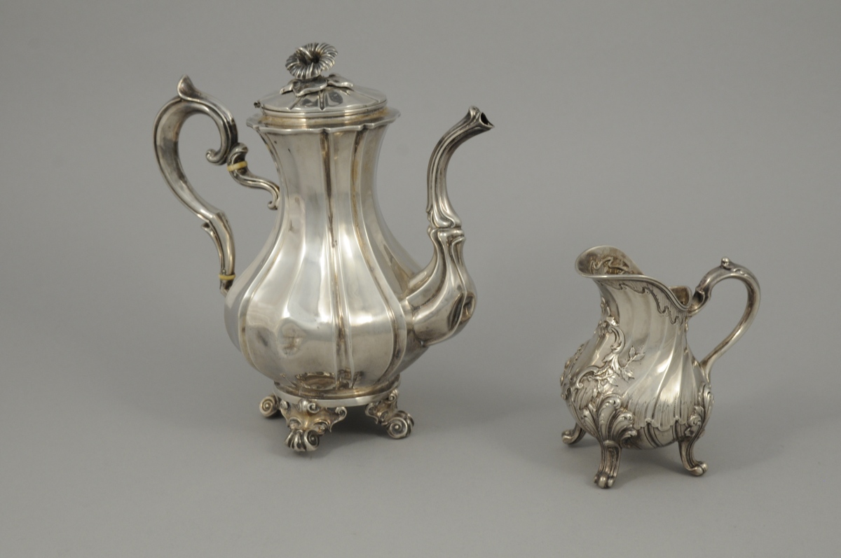 -CAFETIÈRE reposant sur quatre pieds à enroulements. Décor à pans coupés incurvés séparés par de larges cannelures. Anse à volutes et bagues d'ivoire. Bec verseur chantourné. Prise du couvercle en fleur de volubilis. Poinçon Minerve. Fin XIXème, début du XXème. Haut. 24 cm. Poids: 545 g. (enfoncements, couvercle à refixer)