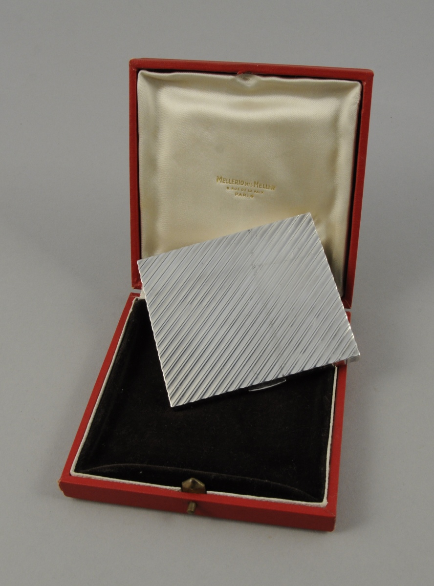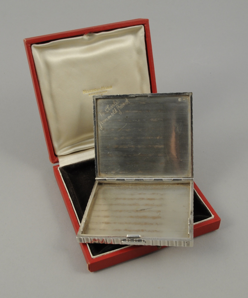 ÉTUI À CIGARETTES en argent à décor de cannelures obliques. Dédicace: "To Charles from an old friend". Poinçon Minerve. Orfèvre MELLERIO. Poids: 135 g. Écrin.