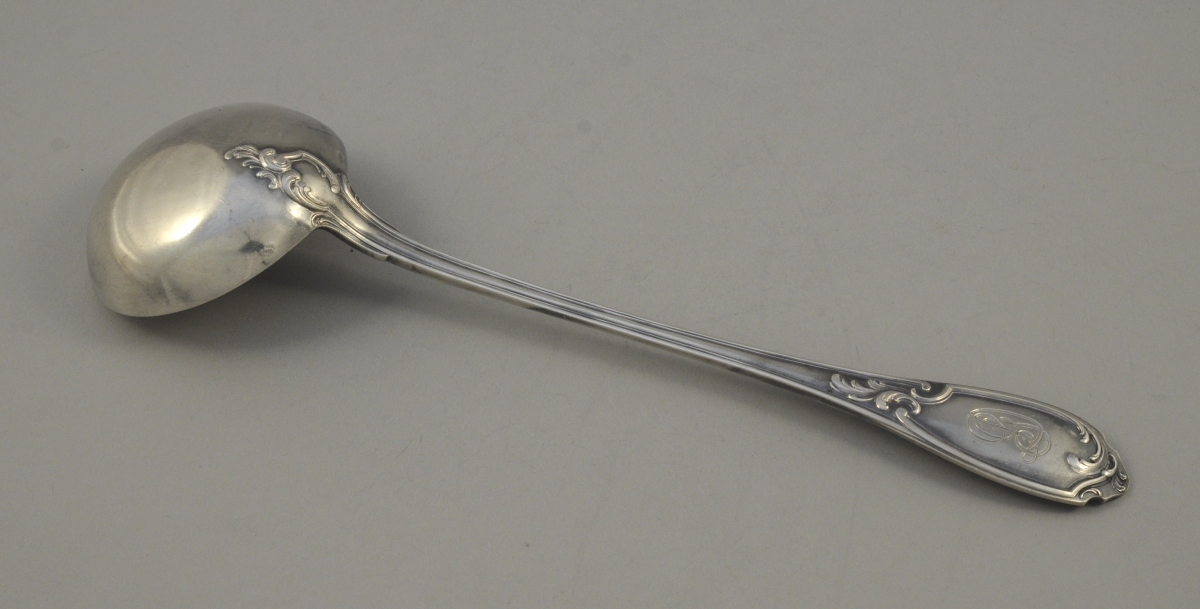 LOUCHE en argent, à décor de filets et de feuillages d'esprit rocaille. Monogramme "DG". Poinçon Minerve. Début XXème. Long. 33,5 cm. Poids: 255 g.