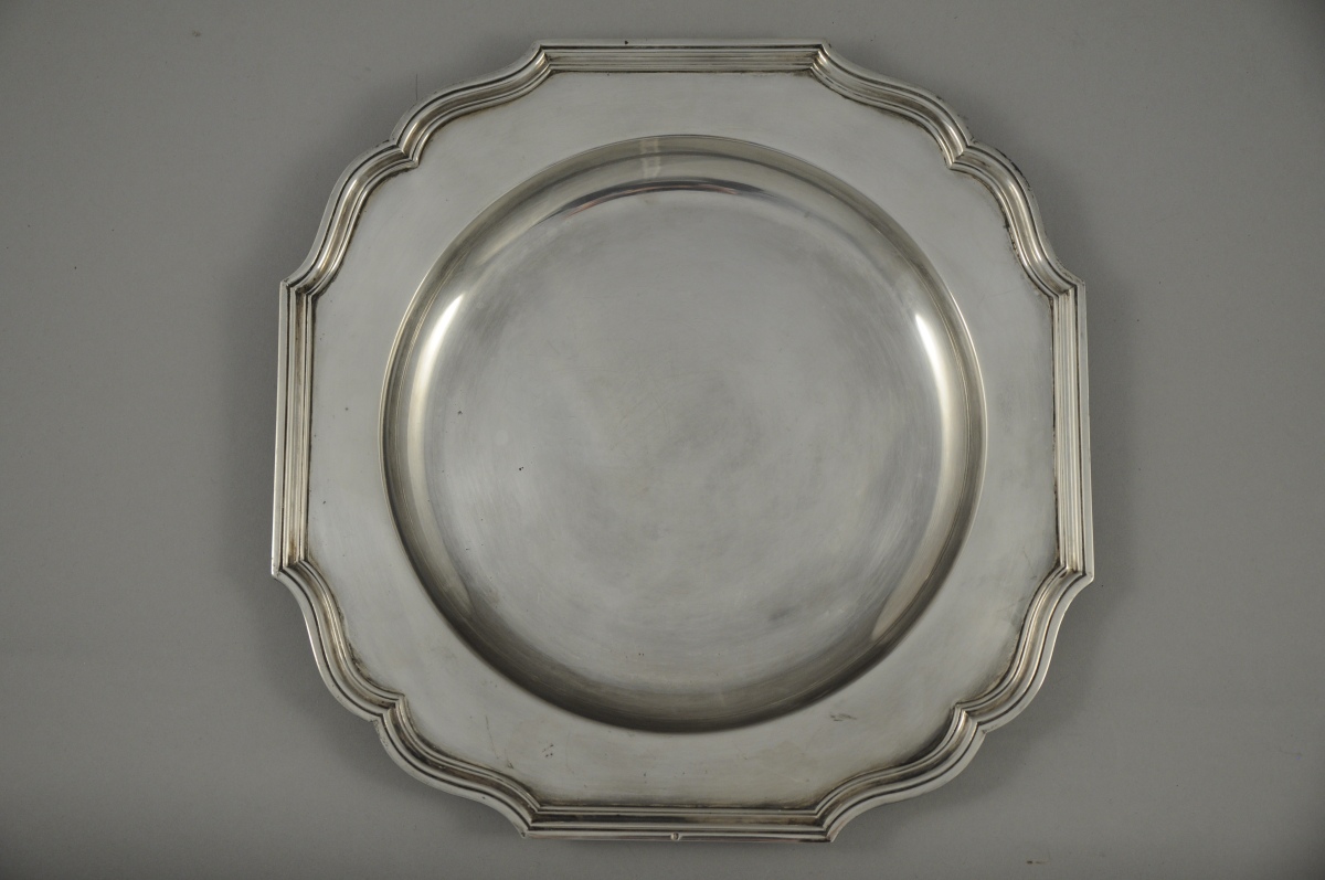 PLAT en argent de forme rectangulaire à bords contournés dans le style Louis XIV. Poinçon Minerve. Fin du XIXème. 31 x 31 cm. Poids: 920 g.