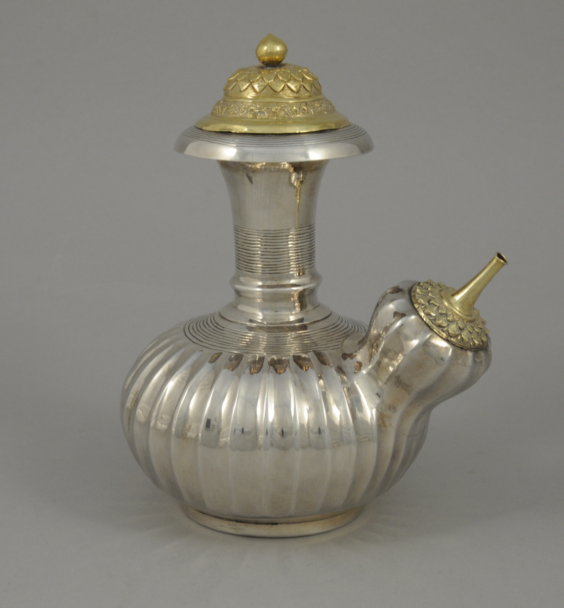 VERSEUSE en argent. Panse et base du bec verseur godronnés. Col strié et évasé. Couvercle et bec verseur en vermeil, à décor au repoussé de feuilles stylisées et de tiges fleuries. Non poinçonnée.