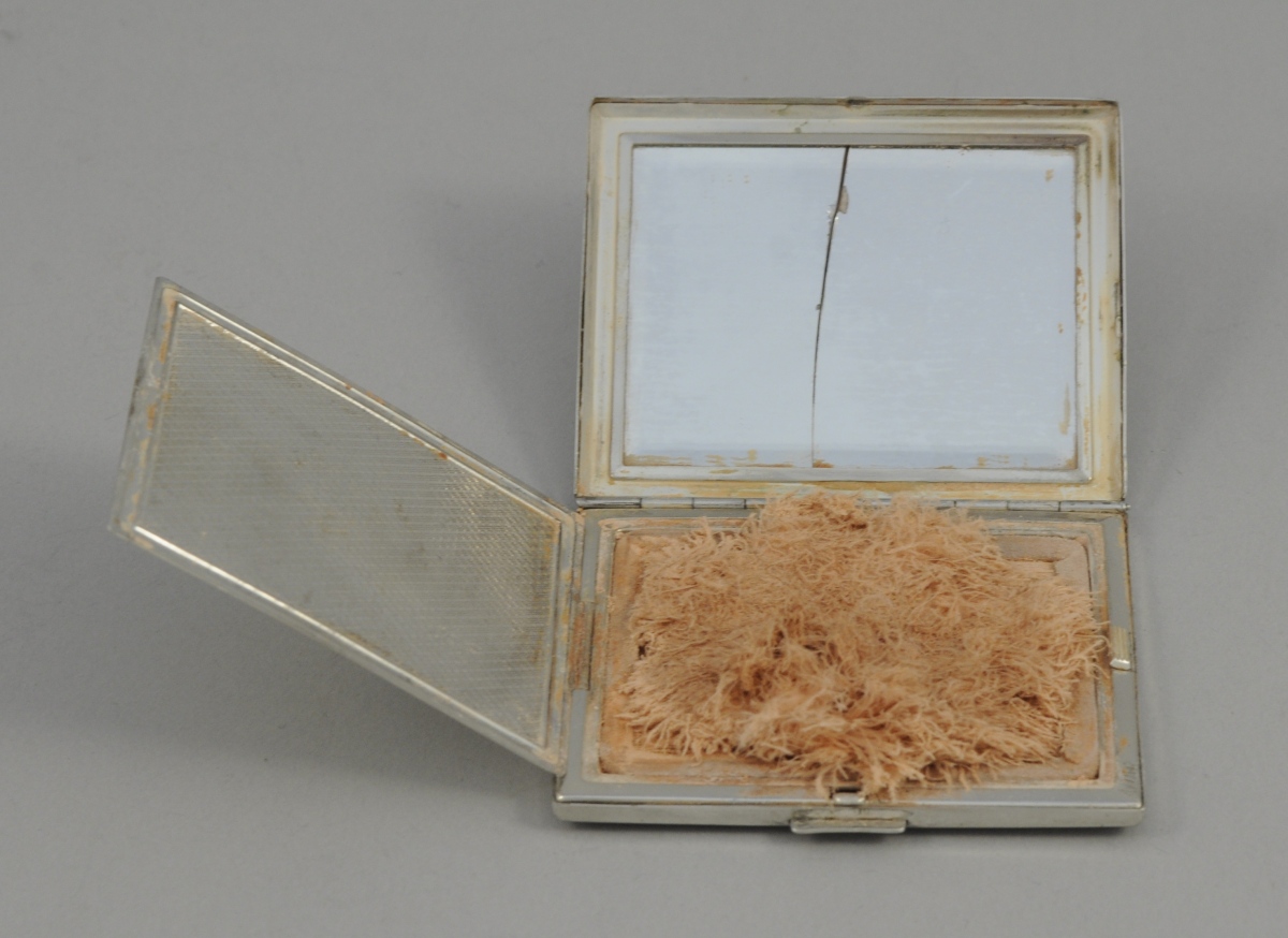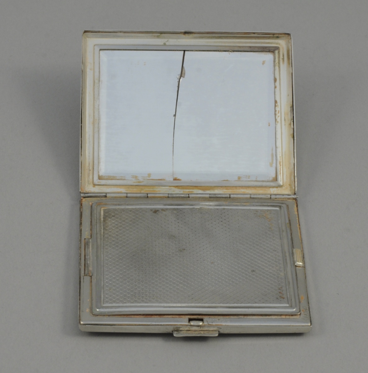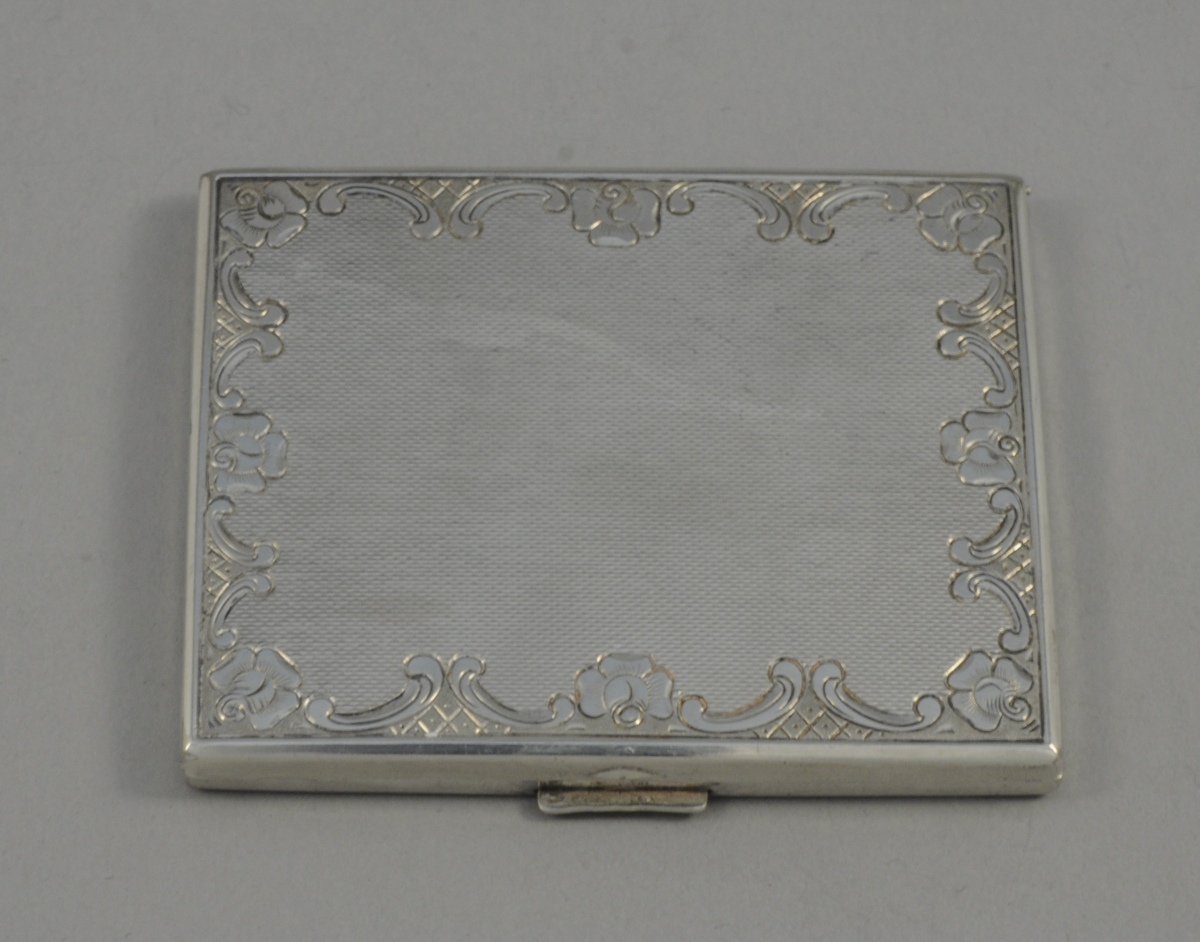 POUDRIER de forme rectangulaire en argent. Il ouvre sur un miroir biseauté et un compartiment à poudre. Décor de frises d'agrafes, quadrillages, feuillages stylisés et guillochage. Poinçon Charançon. Travail étranger du debut du XXème. Long. 8,5, Larg. 7,3 cm. Poids brut: 155 g.