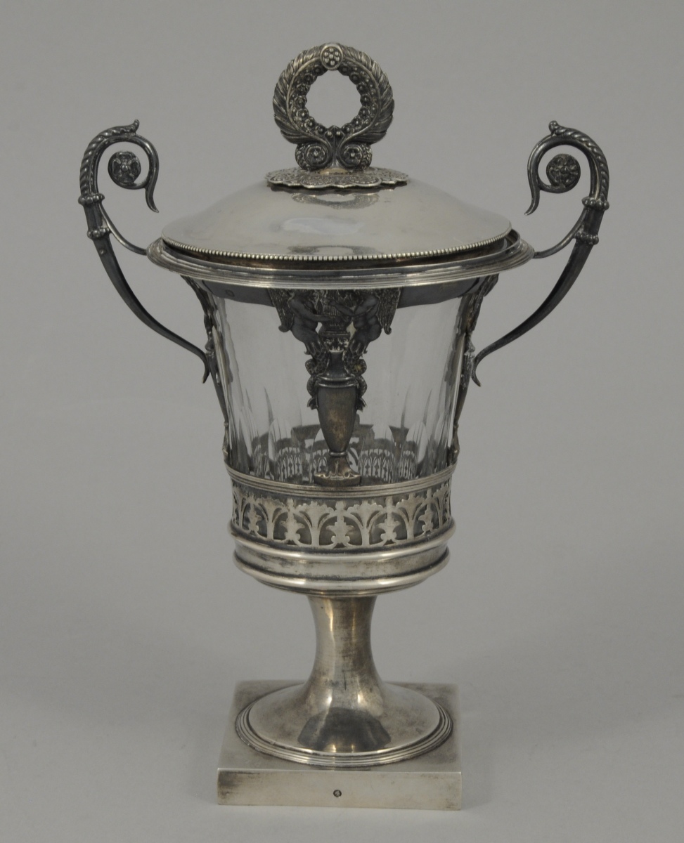 DRAGEOIR en argent. Corps orné de vases surmontés d'Amours jouant de la lyre. Anses ornées de palmes et de rosettes. Bordure inférieure à ajours. Couvercle à frétel orné de lauriers. Piédouche reposant sur une base quadrangulaire. Réceptacle intérieur en cristal taillé à facettes.