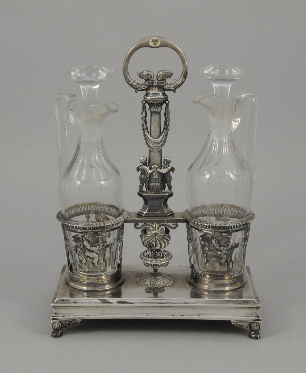 HUILIER-VINAIGRIER en argent. Plateau quadrangulaire mouluré, reposant sur quatre pieds en forme de pattes de lion terminées par des ailettes. Porte-burettes décorés d'Amours portant des flambeaux et chevauchant des chiens. Les ceintures, ornées d'oves, sont réunies par une partie pleine, à laquelle se rattachent deux porte-bouchons ornés de palmes. Tige verticale en forme de colonne, autour de laquelle se trouvent deux Amours, et terminée par une anse circulaire se terminant en têtes de chien.