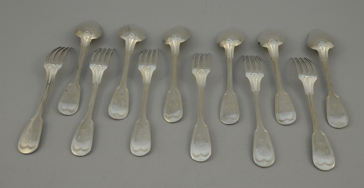 Suite de six COUVERTS en argent, modèle à filets. Monogrammés. Poinçon Minerve.
