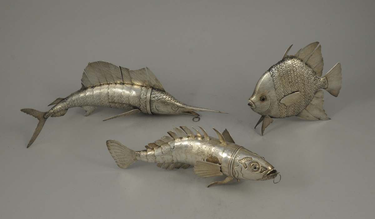 Trois POISSONS en argent, à corps articulés. La tête de deux d'entre eux s'ouvre.