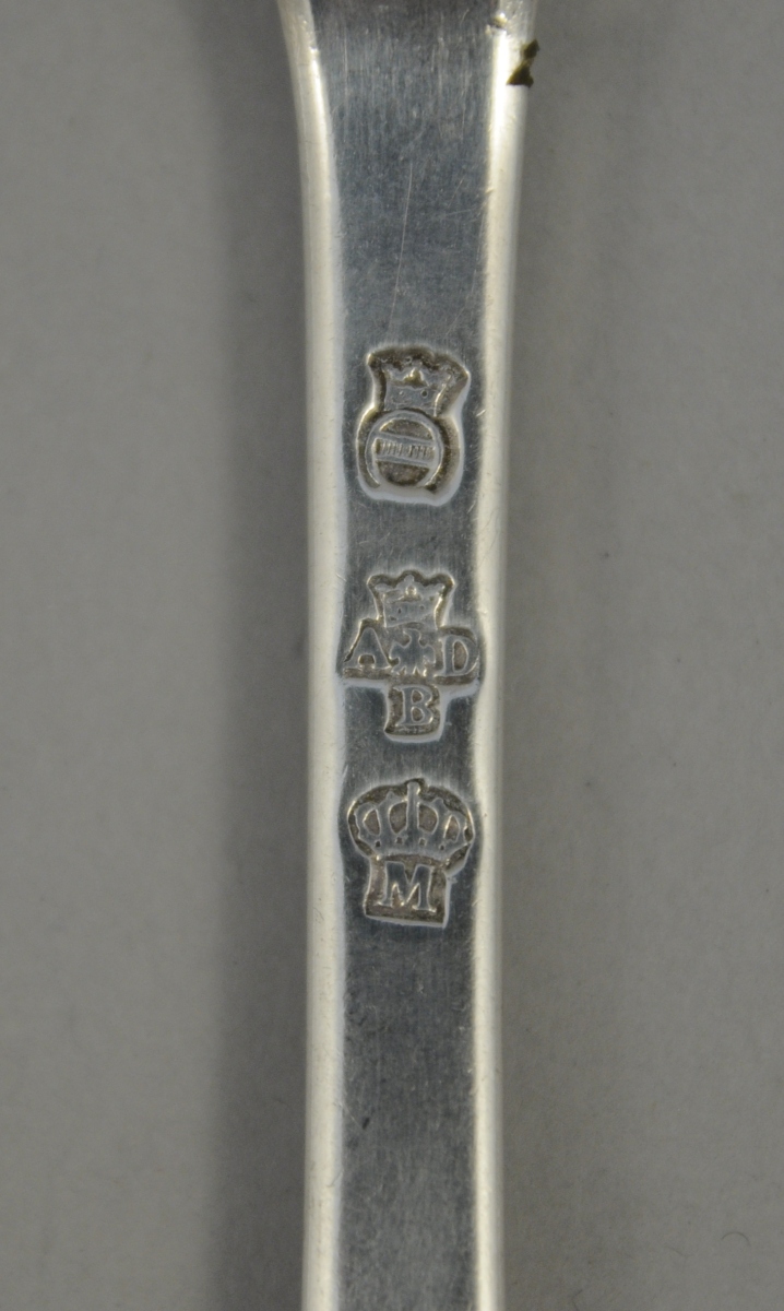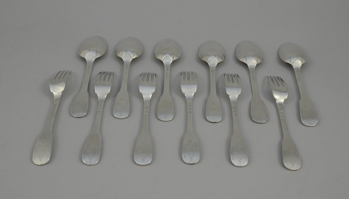 Belle suite de SIX COUVERTS en argent, poinçons des Fermiers Généraux, "M" sous une couronne fermée. Poinçon de maître-orfèvre "ADB". Les spatules gravées d'armes d'alliance du XVIIIème timbrées d'un heaume. XVIIIème. Poids. 895 g.