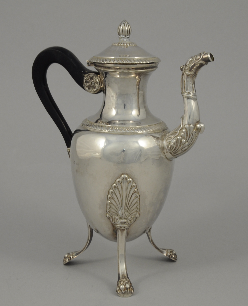 CAFETIÈRE en argent. Elle repose sur trois pieds griffes à décor de palmettes. Bec verseur zoomorphe. Couvercle sur charnière à bordure de petits godrons et frétel à cotes. Anse en ébène.