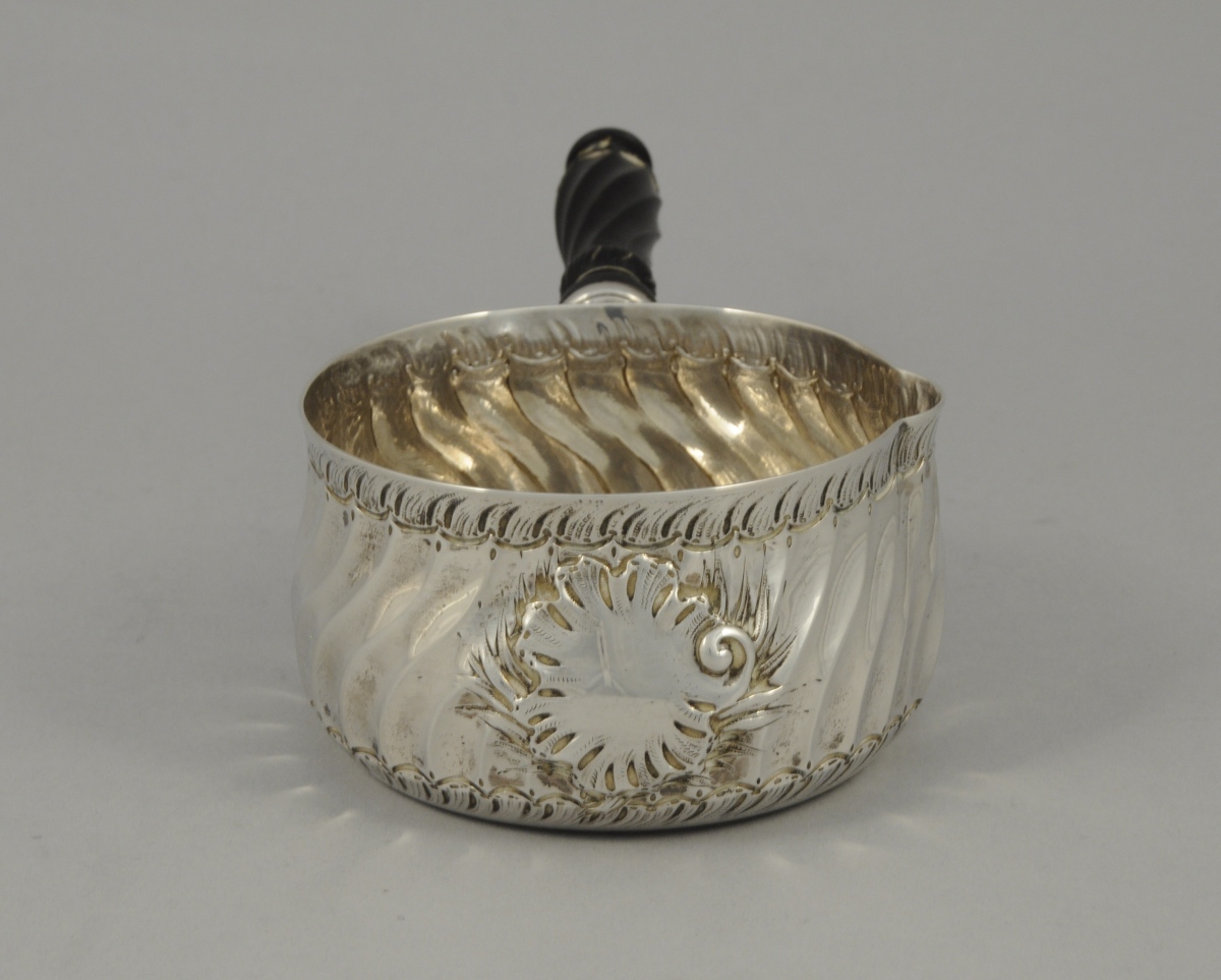 CASSEROLE à SAUCE en argent. Décor au repoussé et ciselé de côtes torses, d'une coquille et de feuilles. Manche en ébène torsadé et sculpté de feuillages.