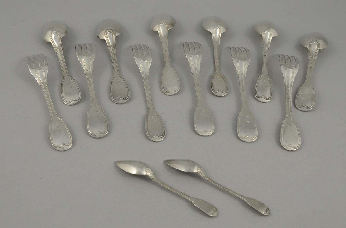 SUITE de SIX COUVERTS de TABLE en argent, modèle filets, initiales PP. Poinçon Vieillard 1819-1838. Joint 2 cuillères à café argent, modèle filets, initiales PP. Poinçon Minerve.