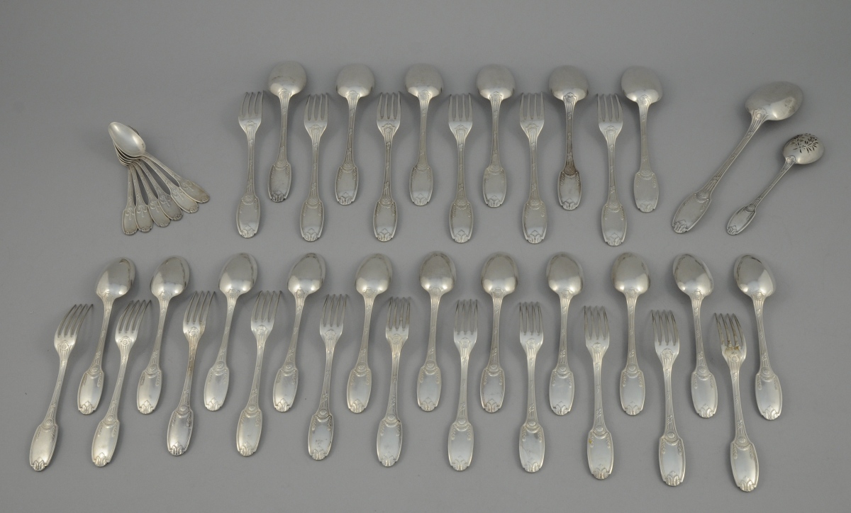Elle comprend 42 pièces: 6 couverts de table, 11 couverts à entremet, 6 cuillères à café, une cuillère à ragoût et une cuillère à olives. XXème. CHRISTOFLE.