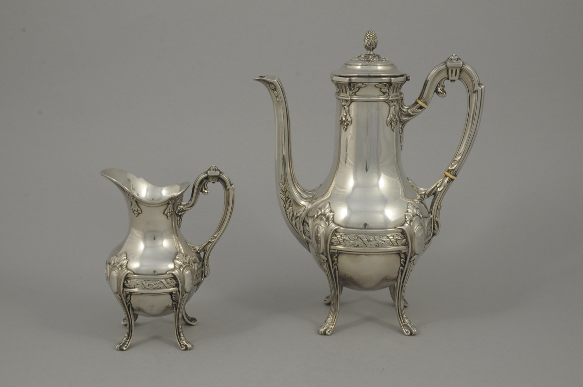 Partie de SERVICE à CAFÉ comprenant une cafetière et un pot à lait en métal argenté. Repose sur quatre pieds cambrés à motifs de larges feuilles d'acanthe. Anses et bec verseur mouvementés orné de feuilles d'acanthe, feuilles de laurier, rosace et filets. Frise de branche de laurier rubannée sur la panse et les pieds. Fretel adoptant la forme d'une graine. Fin du XIXème. Haut. cafetière. 28 cm.