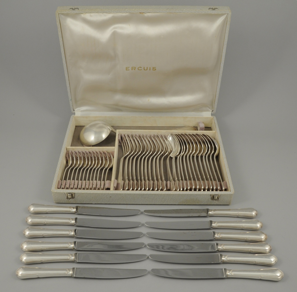MÉNAGÈRE DE TABLE en métal argenté, modèle à filet. Elle comprend 49 pièces: 12 couverts de table, 12 cuillères à soupe, 12 cuillères à moka et une louche. ERCUIS.