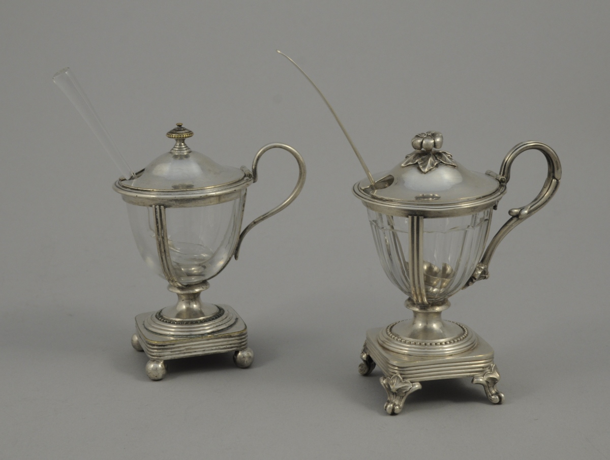 Un MOUTARDIER sur piédouche reposant sur un socle à quatre pieds griffes. Anse en volute. Fretel en forme de fleur. Verre à pans coupés. CHRISTOFLE. Haut. 13 cm. On y joint une cuillère à cuilleron rond.