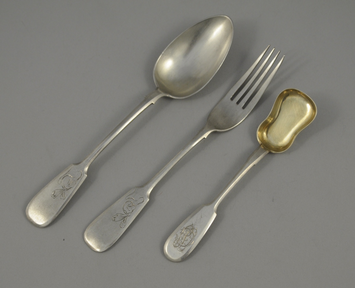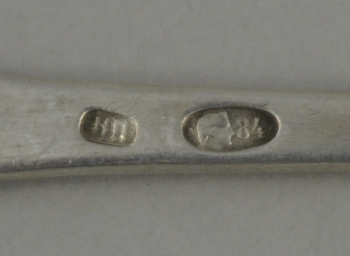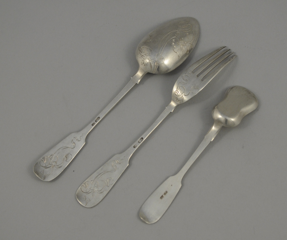 COUVERT en argent. Décor gravé de fleurs et feuillages stylisés. Travail Russe. Poinçon tête de femme 1908-1917. Art Nouveau. Long. 21,8 cm. Poids: 130 g.