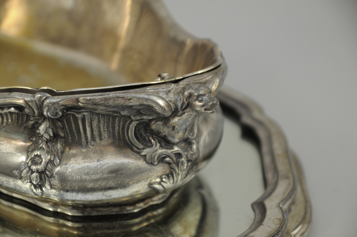 Réunion d'une JARDINIÈRE avec sa garniture intérieure et d'un SURTOUT de table en métal argenté. Le surtout de forme contournée, foncé d'une glace. La jardinière de forme contournée, aux extrémités ornées de chimères ailées, et décorée de motifs rocaille tels que médaillons, coquilles et chutes de fleurs.