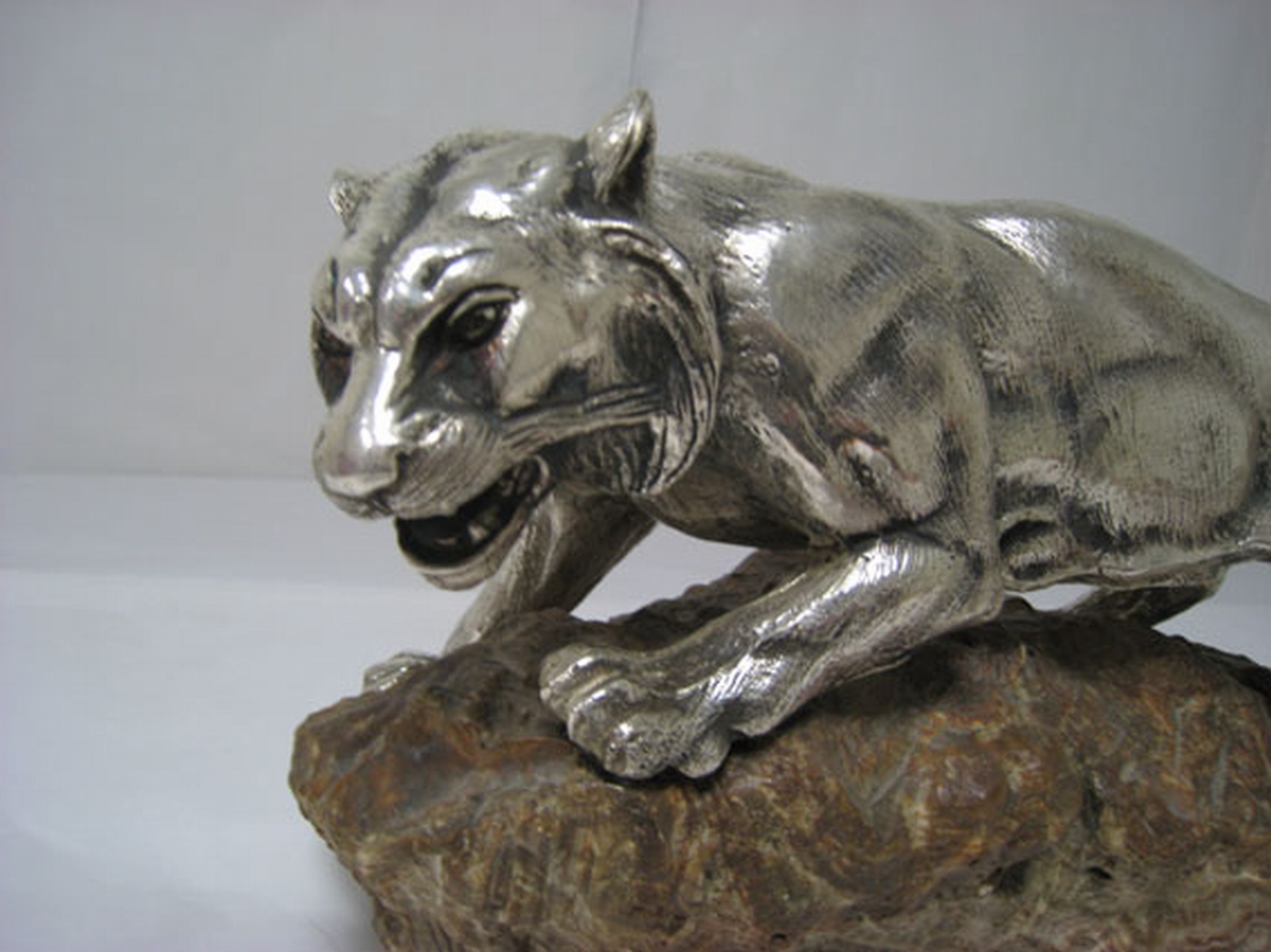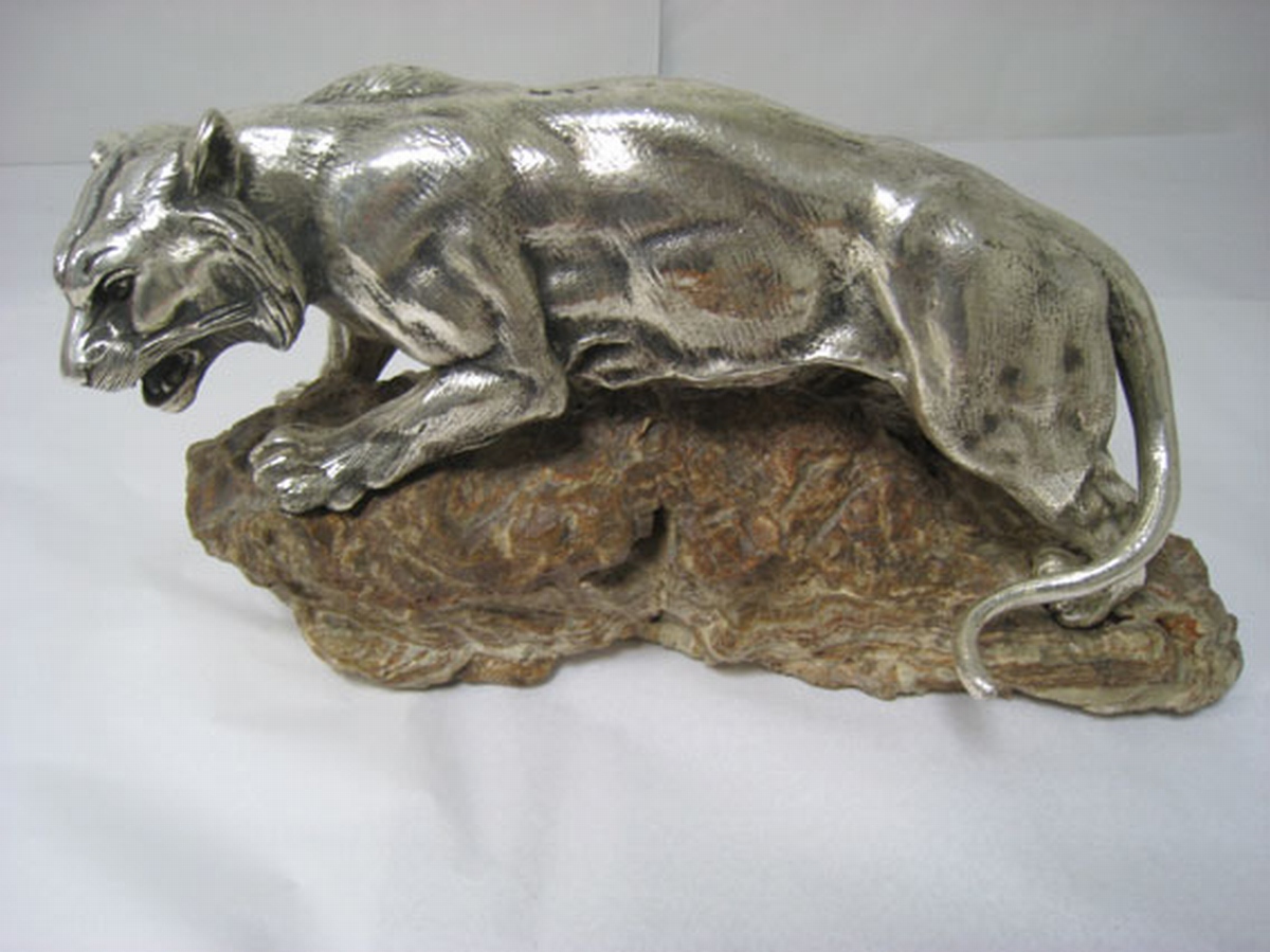 ANDREY. SCULPTURE d'un TIGRE en bronze argenté sur socle en pierre. Signée dans la pierre. Haut. 16,5, Long. 36,5 cm. Avec socle. Haut. 24, Long. 44 cm. haut: 24cm.