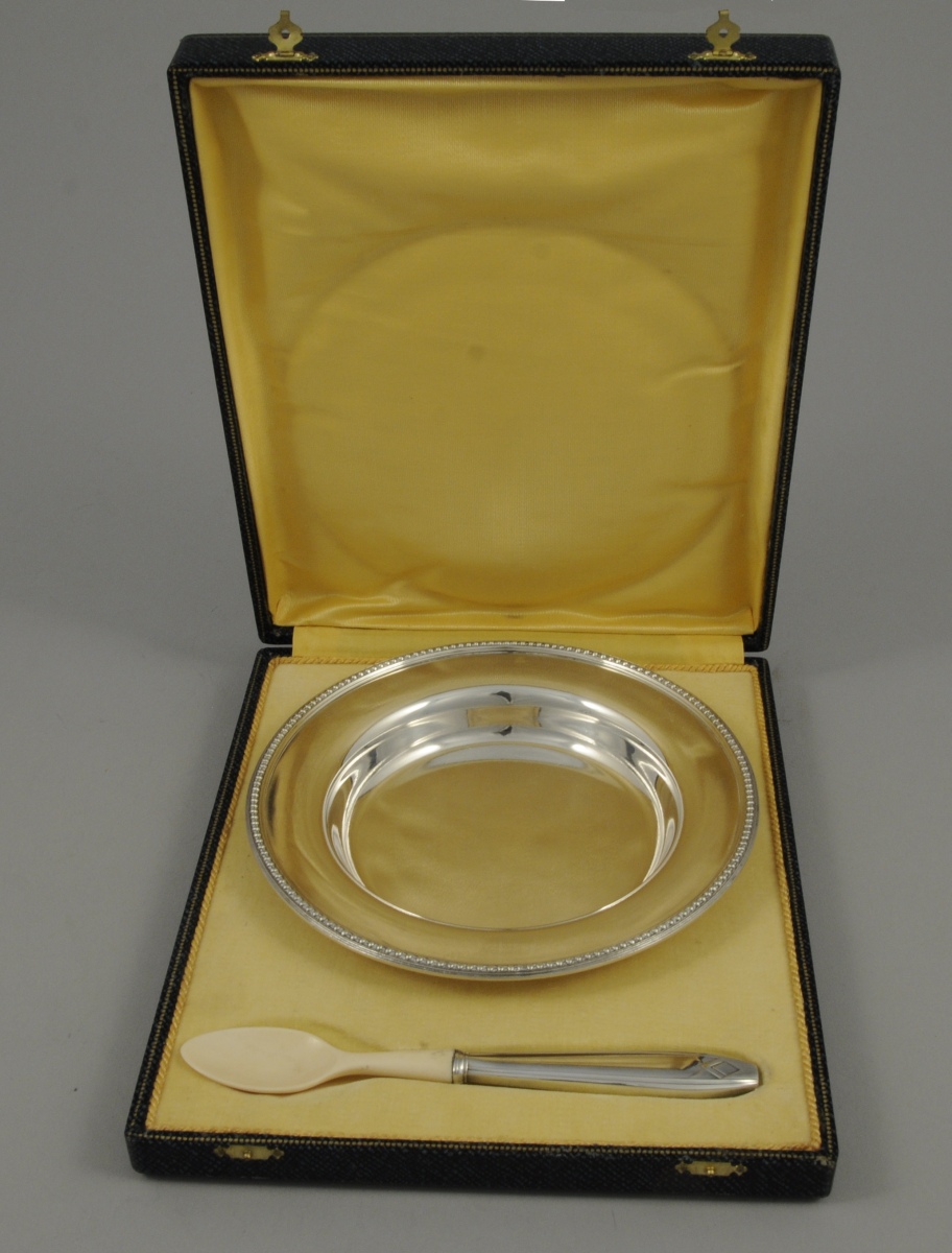 Un COFFRET de naissance, avec une assiette à décor d'un rang de perles et une cuillère à bouillie en métal argenté. Cuilleron en ivoire. Dans son écrin.