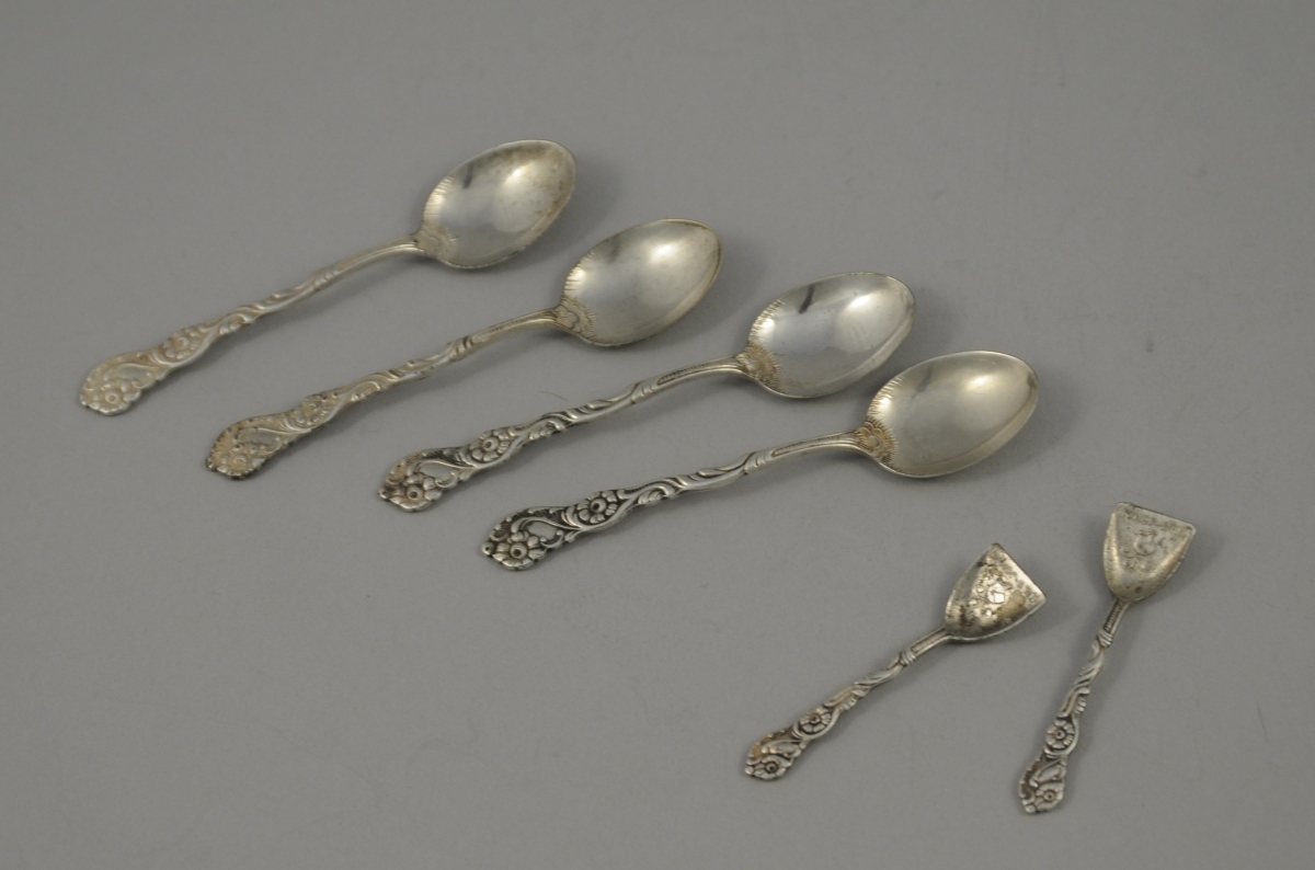 Un ensemble de quatre CUILLÈRE à moka et deux PELLES À SEL en métal argenté. Décor de rinceaux fleuris et coquilles stylisées. Marque "EXTRAPR.NS.ALP. / SWEDEN" sur les cuillères à moka. Heaume et marque "Nils Johan" sur les pelles à sel. Travail suédois. XXème.
