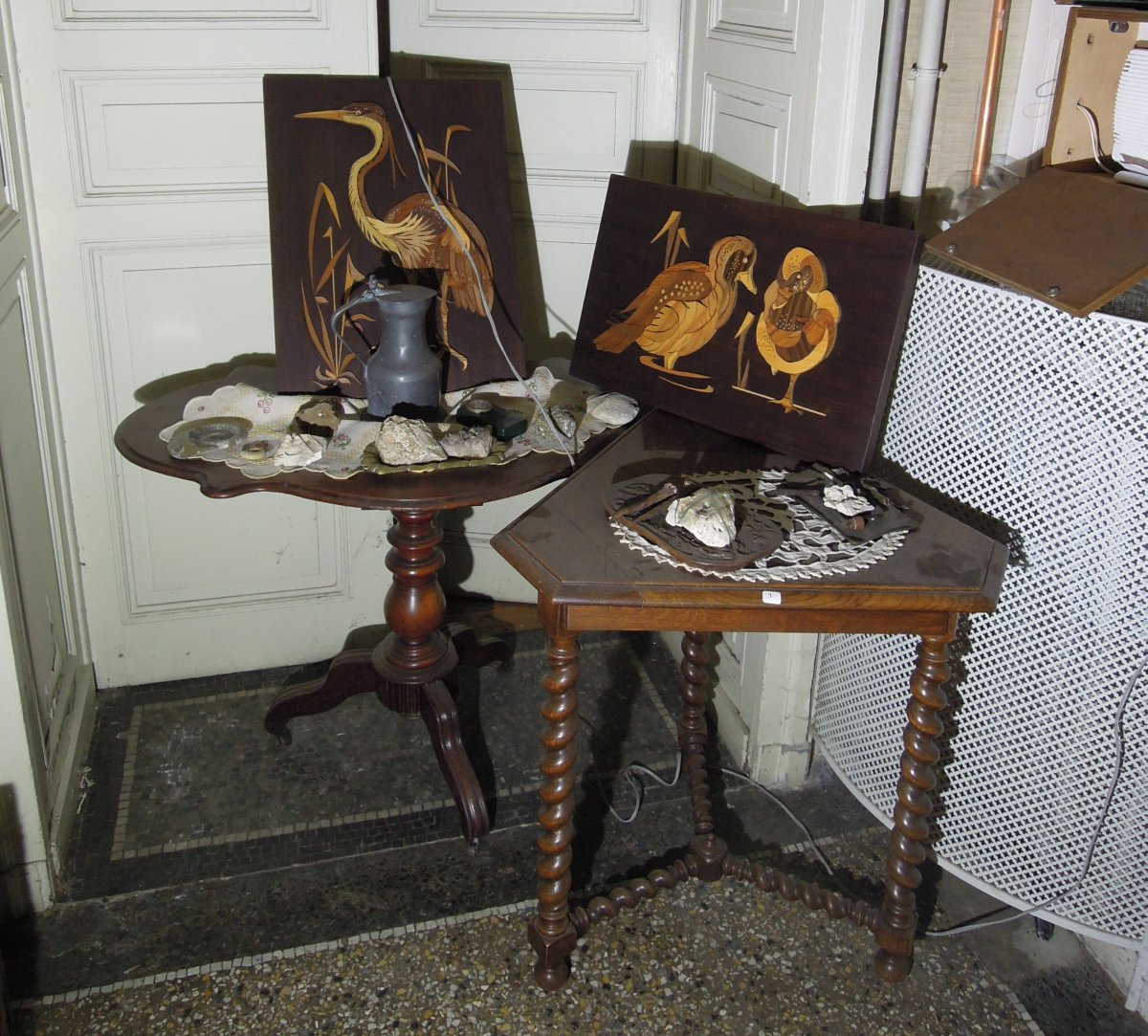 Joint: Deux PANNNEAUX en bois marqueté: Héron et Canard.
